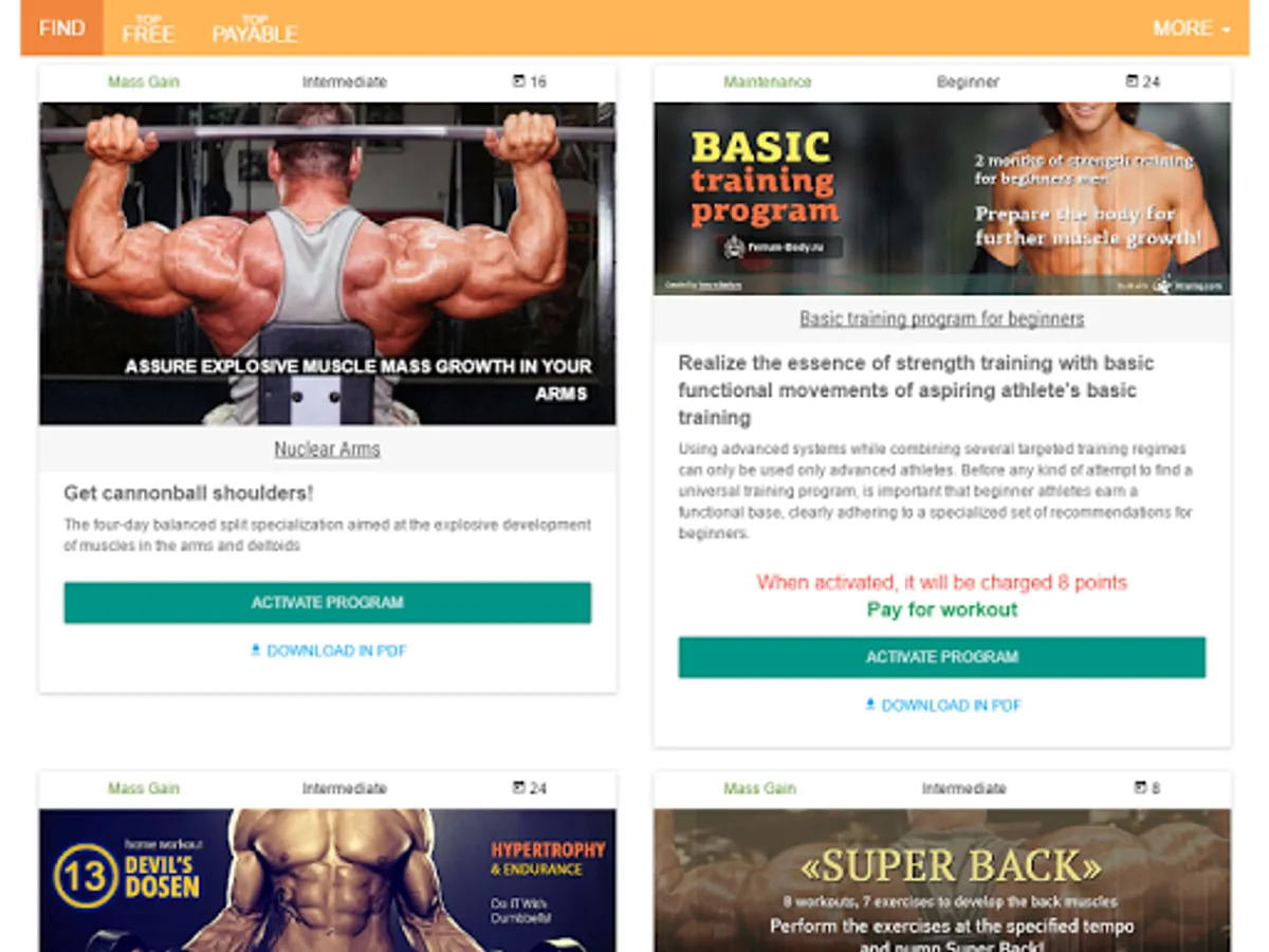 The training programs offered in this muscle and fitness app for Gain Mass and Lean Body are designed taking into account the principles of modern bodybuilding workout. You can choose - to train with machines, barbells, dumbbells or body weight at your own convenience. Home Workouts became more diverse and interesting.