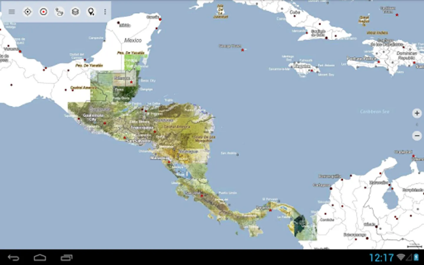 The topo maps layer is a seamless mosaic of more than 1000 georeferenced maps. Although some of the maps are quite old (production range of the maps is 1955 - 2006) they are still very good for outdoor trips, especially if you are looking adventurous routes or abandoned places. Most maps of Guatemala are quite up to date (mostly created in the 90ies) while maps of eastern Nicaragua were created in the 60ies/79ies. Within the app you can open an overview map with the publishing dates of the maps.