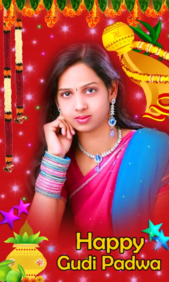 It is celebrated in and near Maharashtra on the first day of the Chaitra month to mark the beginning of the New year according to the lunisolar Hindu calendar Gudi Padwa Photo Frames and Cheti Chand are best to beautify some moments.Gudi Padwa or Ugadi festival marks the beginning of New Year in Maharashtra, Andhra Pradesh and parts of Karnataka. This festival is known as Gudi Padwa in Maharashtra. Gudi Padwa is considered as an auspicious occasion to buy ornaments, house and other new things. Now a days wishing on any of festival like Gudi Padwa, people used to send sms text messages wishes to there friends, relatives and everyone.Your pictures will be perfect with these fantastic romantic Gudi Padwa Photo Frames.Have this photo frames app and give to your photos awesome look with Gudi Padwa Photo Frames.Send Gudi Padwa Wishes by making use of this application and you will be amazed by the response that you get.Make some good Gudi Padwa cards using this application and earn love from relatives.Thus Download the app called " Gudi Padwa Photo Frames" and use it for free.To use this app is also very simple just select any picture which you want to frame and then select a beautiful Gudi Padwa Photo Frames and set it using zoom and rotate button and save it.Thus share this with your loved once on whats app,Facebook, twitter,Instagram.