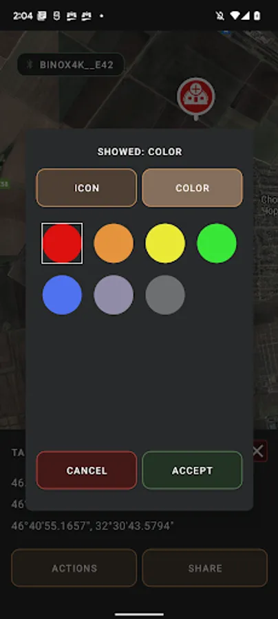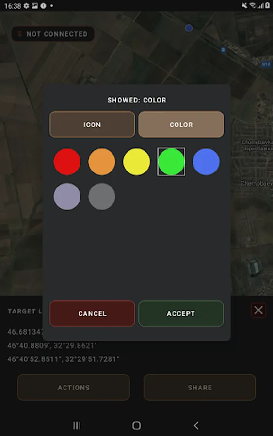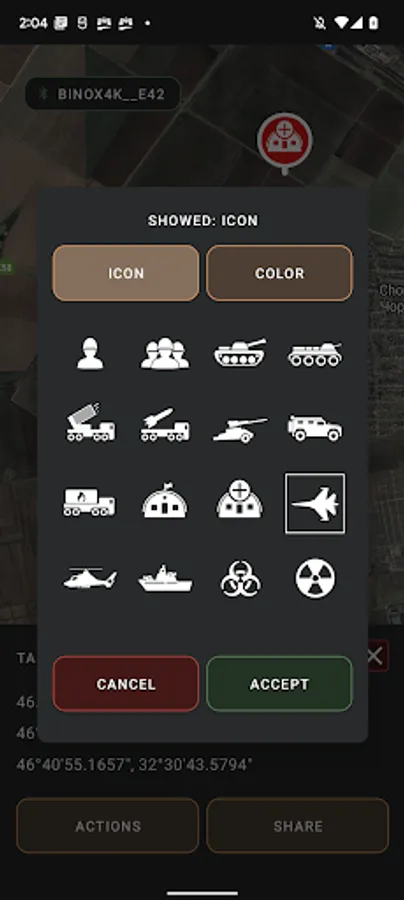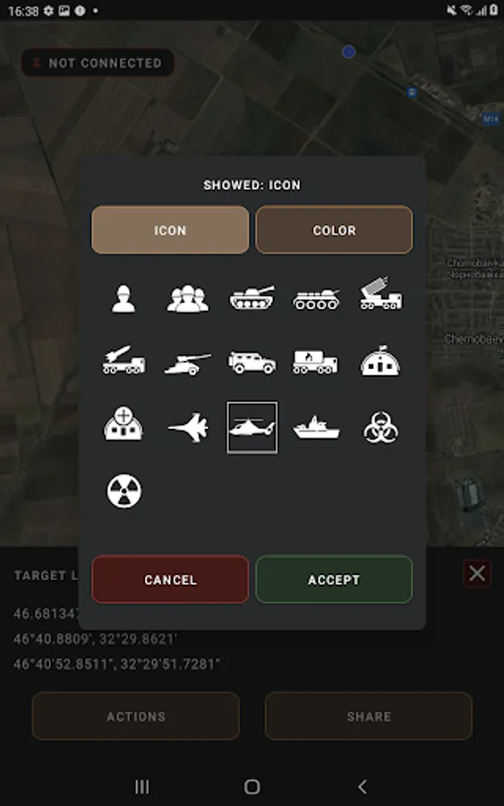 Information gathered by the app can be sent to a tactical command center or artillery, targets location's data can be shared via any installed messenger and email.