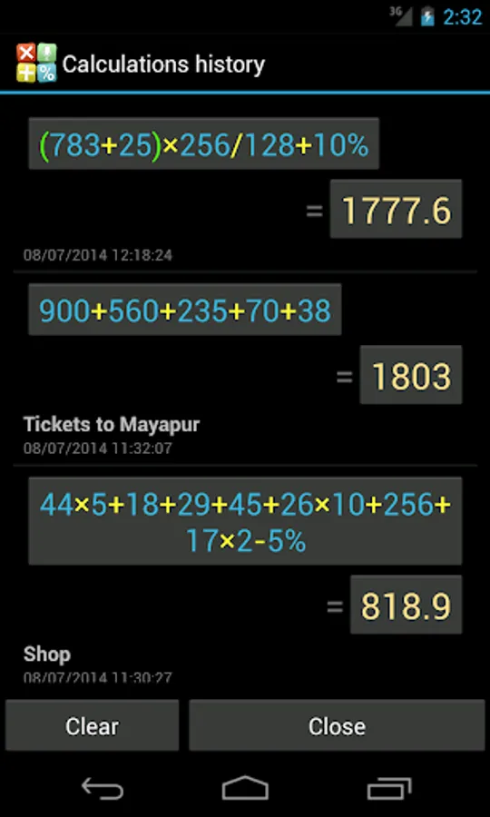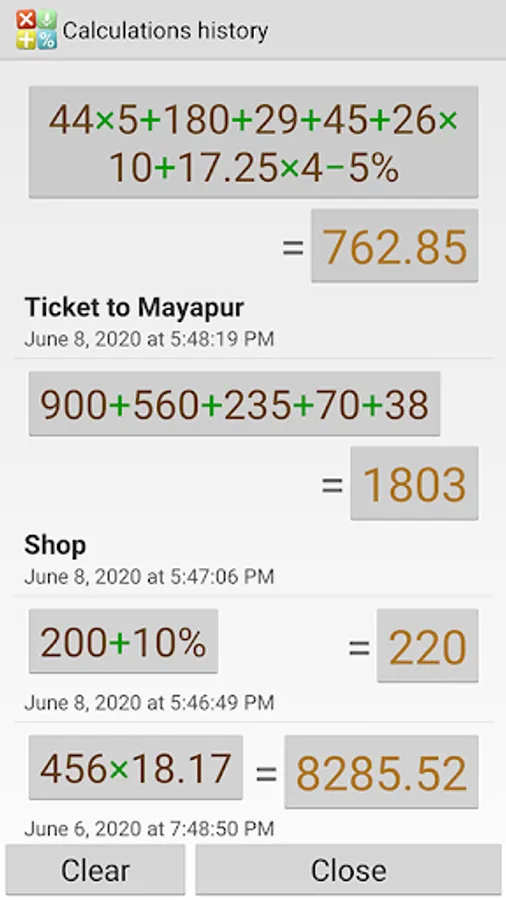 ✓ All calculations are recorded in the calculations history, from where you can insert the expression and result into the editor. These records can be instantly deleted with a horizontal swipe. Any record from the history can be tagged with text by tapping the date or time.