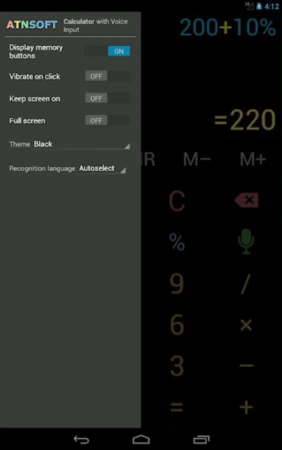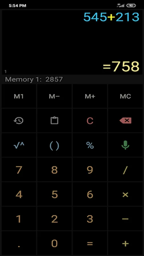 ✓ Instantly enter numbers and mathematical expressions using an ergonomic on-screen keyboard and voice input (currently supports English, Arabic, Bengali, Chinese, Croatian, Czech, Dutch, French, German, Greek, Hindi, Hungarian, Indonesian, Italian, Japanese, Korean, Polish, Portuguese, Romanian, Russian, Spanish, Swedish, Tamil, Thai, Turkish and Vietnamese). Just press the mic button and speak the expression (for example, 74 point 5 times 4 plus 37 = 74.5 × 4 + 37 = 335): it will appear on screen and the result will be calculated immediately!