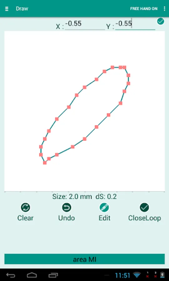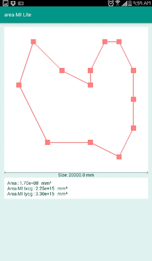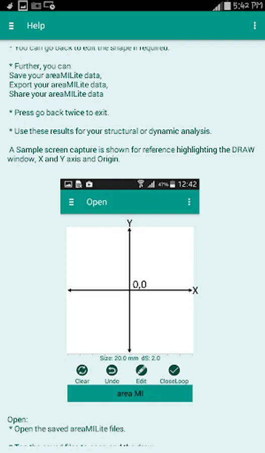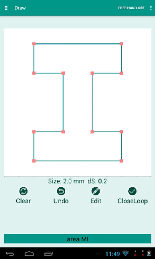 Draw non intersecting outer by tapping the vertex of your 2D shapes. Draw your geometry using both free hand and straight lines. You can also create a hole or cut by tapping the vertex of your cut or hole. Then click “area MI” to calculate the Sectional properties. The default drawing window size is 2 mm and snap size is 0.02 mm. You can change by tapping the settings. You can also edit the X,Y coordinates of the vertex for more accurate input. Select your convenient Units. Set the window size to the maximum size of your 2D shape. This size can be set to any size from nano meter (10-9) to giga meter (10+9). Area MI lite tool supports any shape bounded outer by straight lines. Draw by tapping the vertex in clock wise or counter clock wise pattern. Avoid crossing of the boundary. The end point can be closed by tapping close end. Clear, Undo, Edit and CloseLoop buttons are useful to start with any shape, edit the vertex to change shapes, add lines, or move lines and or close the boundary.