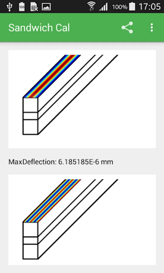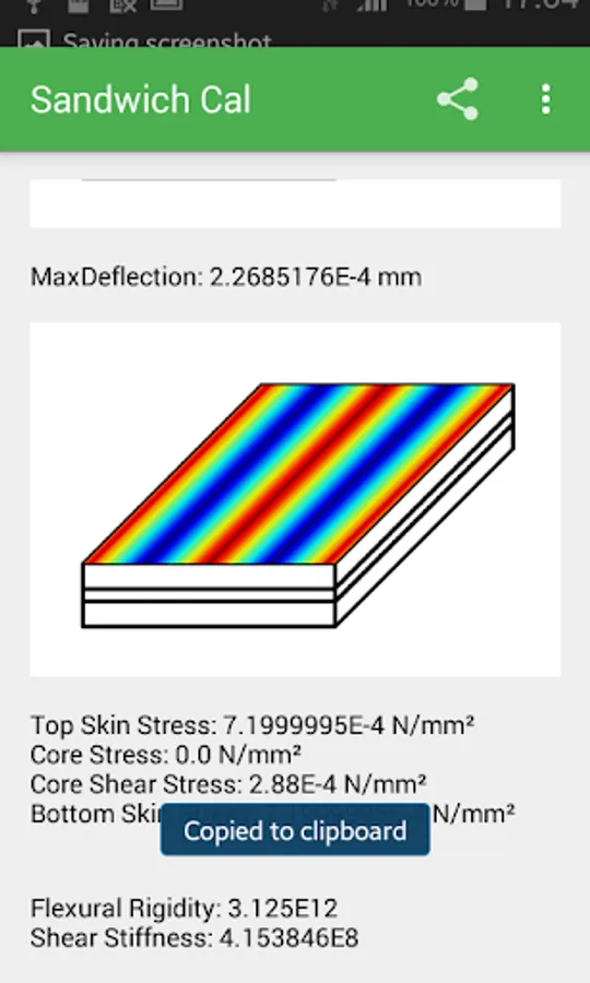 9. The results window will display the sandwich deflection, stress and along with material, load, and boundary and analysis details.