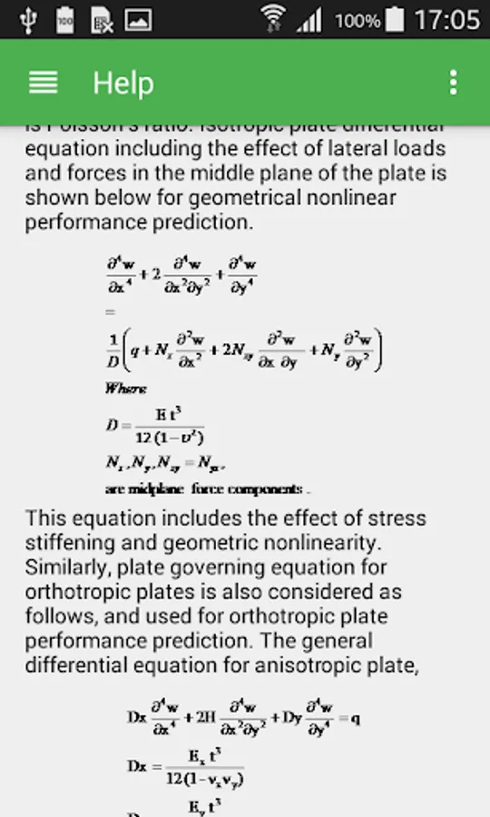 Isotropic plate differential equation including the effect of lateral loads and forces in the middle plane of the plate used for geometrical nonlinear performance prediction.Similarly, orthotropic plate governing equation is also considered for orthotropic plate performance prediction