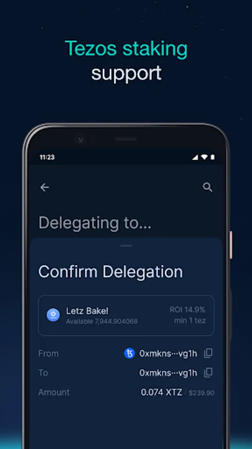 • Staking Tezos: Delegate your Tezos (XTZ) to trusted bakers from the Baking Bad list and bring an income.