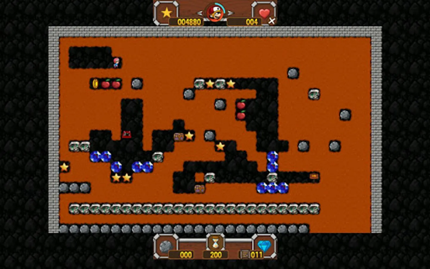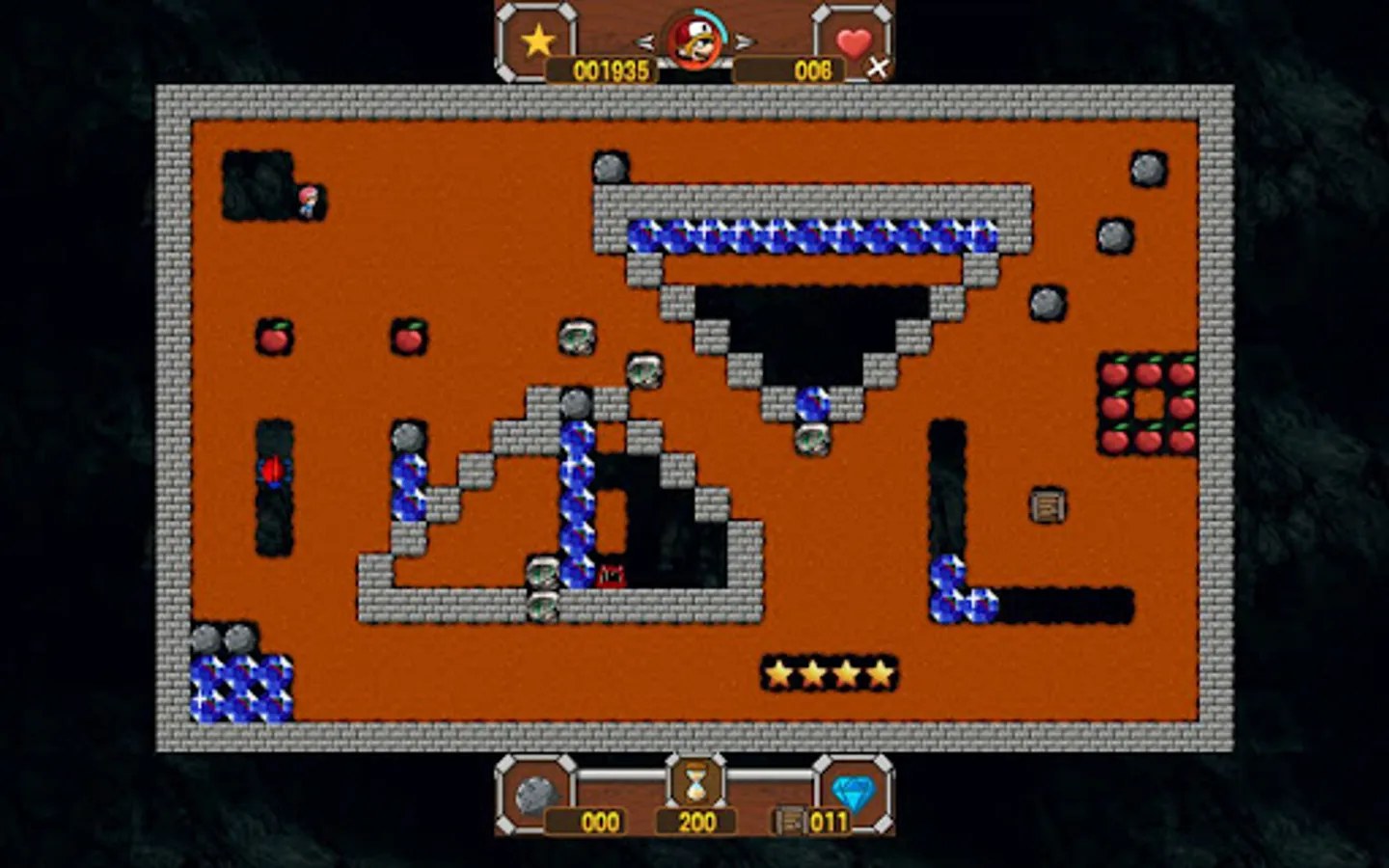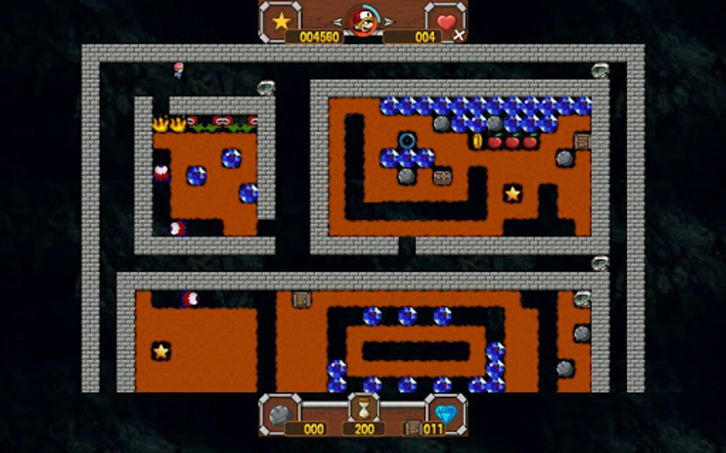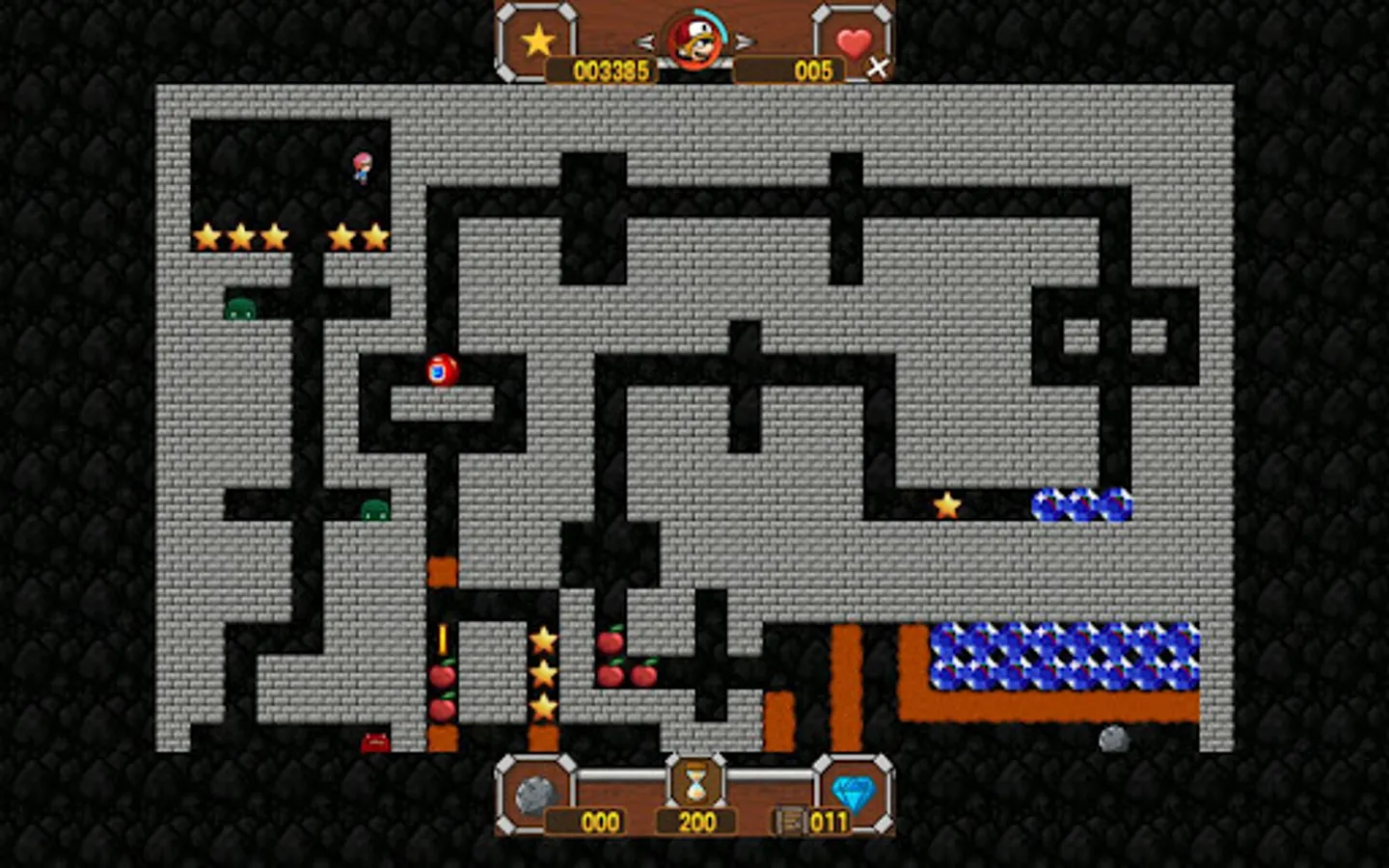✔️ The pit-man is placed in an underground maze and can dig horizontal and vertical tunnels through it. At least one tunnel already exists at the start of the game. Emeralds (usually in clusters) and bonuses are located at different points of the labyrinth. Monsters spawn at different point of labyrinth. If you dig the earth out from under the stone, the stone will sway for a few seconds, and then fall. Stone can be pushed left or right into vertical paths, with similar results. Falling stone and bonuses will squash monsters, but they will also squash the digger. The pit-man has a weapon, this is bombs which he can set on different places and bombs will destroy all around place set. This game is a re-imagining of the classic retro game the Digger .