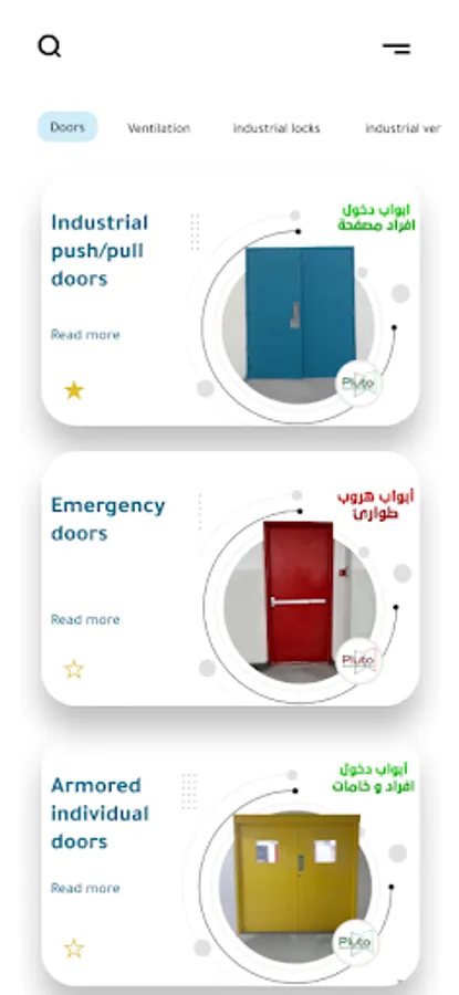 شركة بلوتو من الشركات المتخصصة في مجال تصنيع الأبواب المصفحة الصناعية بكل انواعها.وعلي مدار ٩ سنوات عمل في مجال صناعة الابواب أصبحنا قادرين علي تقديم منتج افضل بجودة عالية وسعر منافس.وكذلك تقديم الاستشارات الفنية الخاصة بالابواب. ملخص لأنواع الابواب التى نقوم بتصنيعها: الأبواب المصفحة الصناعية بمختلف انواعها - ابواب هروب الطوارئ المقاومة للحريق والغير مقاومة للحريق. - ابواب دخول وخروج الخامات والأفراد لعنابر الأنتاج فى المصانع. - ابواب مصفحة للمكاتب والمخازن وحجرات الخزنة. - ابواب مزودة بجريل تهوية سفلى لحجرات المولدات الكهربية. - ابواب مزودة بكالون مغناطيسى وAccess Control للمعامل والمستشفيات. - جريلات تهوية مزودة بمراوح شفط للمصانع. - ابواب دكت للمنشأءات السكنية والصناعية. توريد وتركيب الكوالين والأكسسوارات الصناعية بمختلف انواعها - كوالين هروب طوارئ - كالون برفاص سلندر كمبيوتر - كالون تأمين سلندر كمبيوتر - ماكينة غلق ذاتى - طقم اكرة على بالتة استانليس - طقم Push / Pull استانليس - كالون مغناطيسى + Access Control توريد وتركيب الأبواب المصفحة المنزلية اعمال صيانة للأبواب الصناعية والمنزلية تقديم الأستشارات الفنية الخاصة بالأبواب.