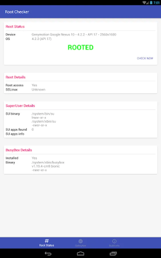 This app provides information for Root access checking, it tell you if your device is Rooted, checks if any SuperUser app is installed and also show you BusyBox installation on the device.