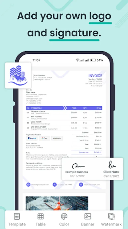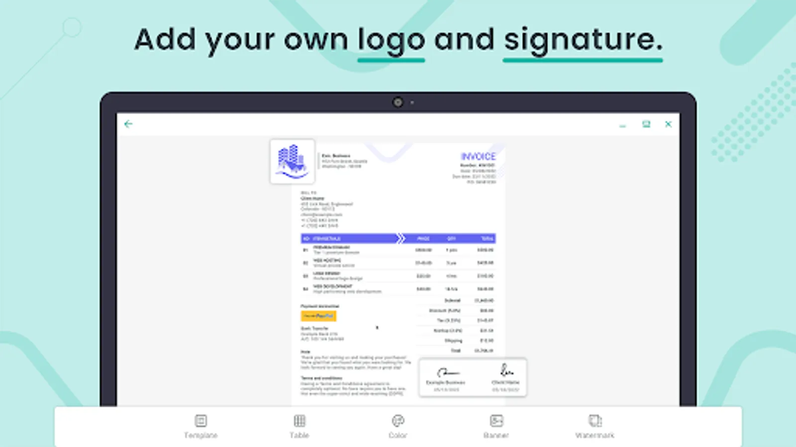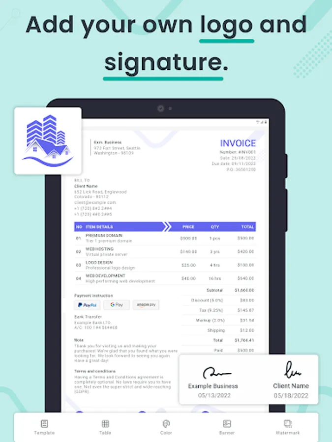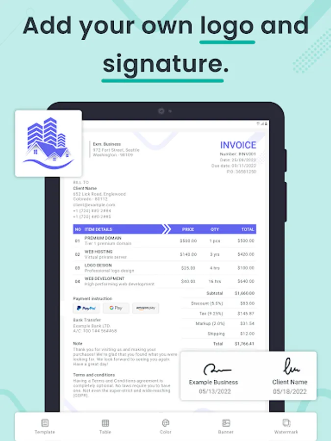 This simple invoice maker app allows you to create invoices easily. When you create an invoice or estimate, add your business logo and signature. Use an invoice template from tons of in-house invoice templates and localize it. This app is best for invoicing, estimating, GST billing, and generating accounting or bookkeeping reports.