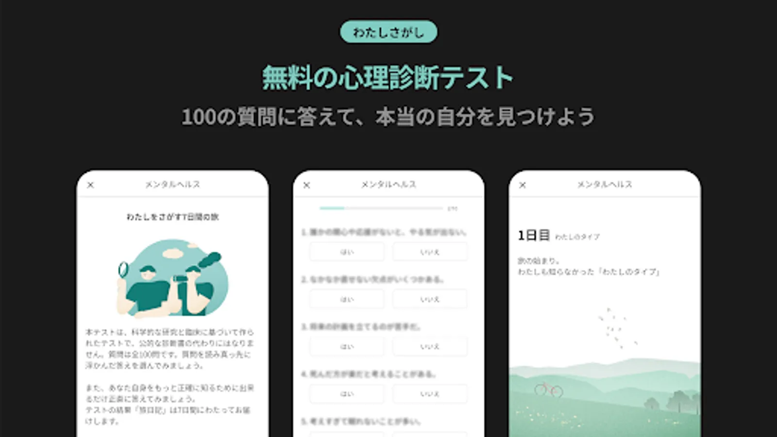 At Mind Cafe, you can take a free psychological diagnostic test called "Watashi Sagashi". What kind of person am I really? Why don't you go on a journey to find your true self? After answering 100 questions created by Mind Cafe's psychology research institute, test results called "Travel Diary" will be delivered by theme over 7 days. Why don't you come face to face with yourself and meet the real you through the journey of searching for me?