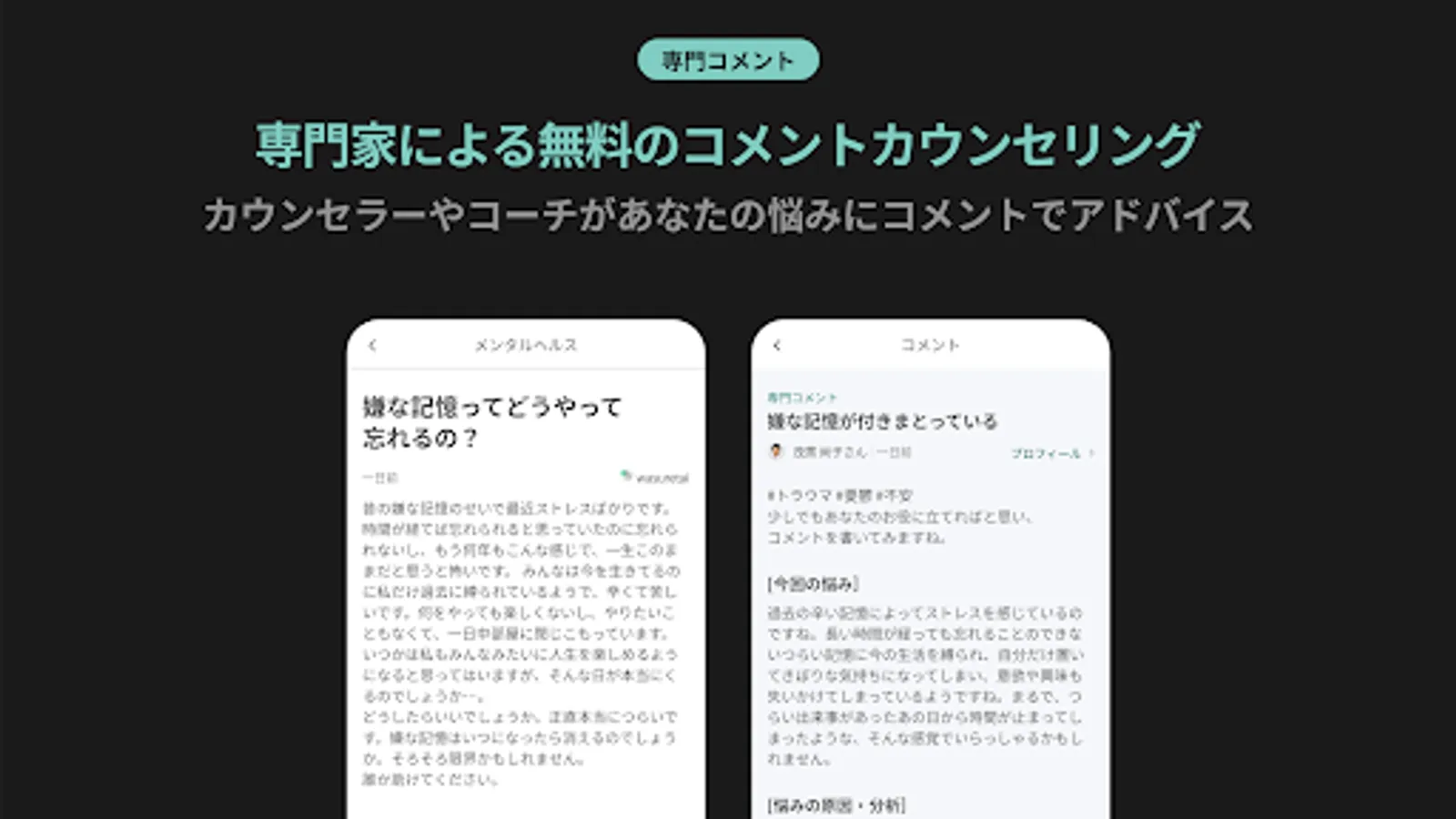 At Mind Cafe, experts such as counselors and coaches give advice on your worries and consultations through comments. While explaining in an easy-to-understand manner specialized advice that family, friends, and people around you cannot get, they guide you to find the background and cause of your worries and guide you to a solution. Mental illness, like physical illness, requires proper treatment and care. Just like going to the hospital when you catch a cold, let's face a cold with Mind Cafe's experts.