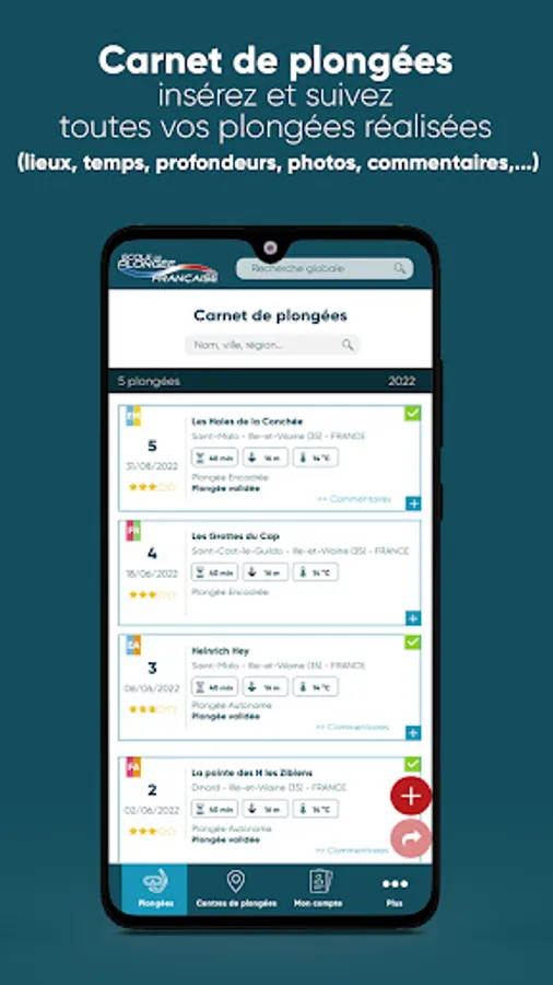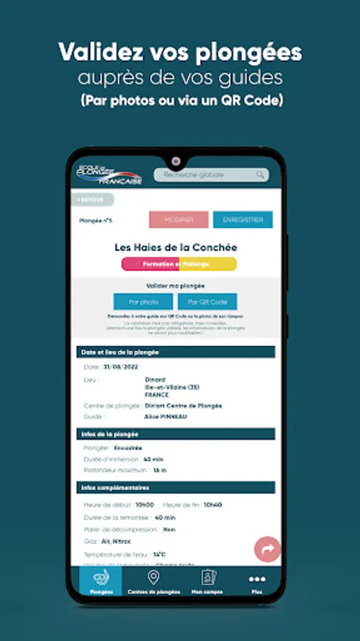 Combining the functions of dive log and "digital wallet", you can record all your dives with photos and store all your diving levels issued by the ANMP, or by any French or foreign organization.