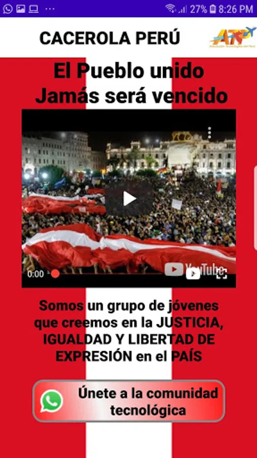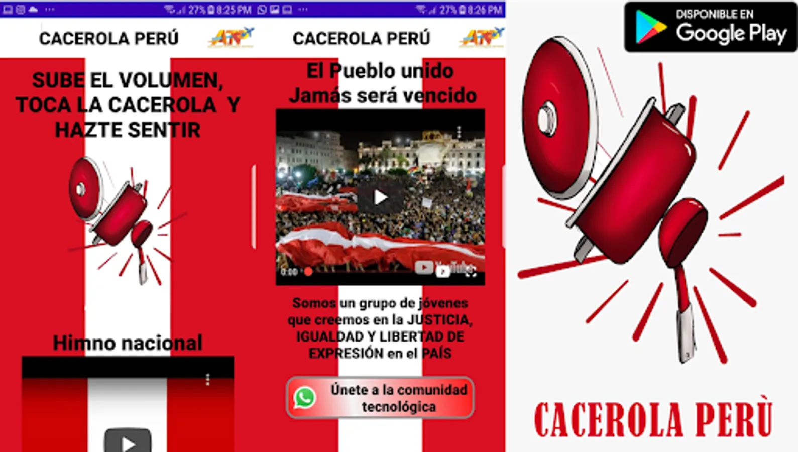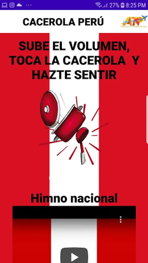 The Technological Association of Peru, given the situation in the country, decided to create a mobile application and a free web application, available for all citizens who wish to demonstrate to do so peacefully without the need for tools or utensils that could harm citizens. . This application allows to execute the sounds of pans from the platform and at the same time has the possibility of executing the National Anthem of Peru and entering a community of professional technological volunteers, just