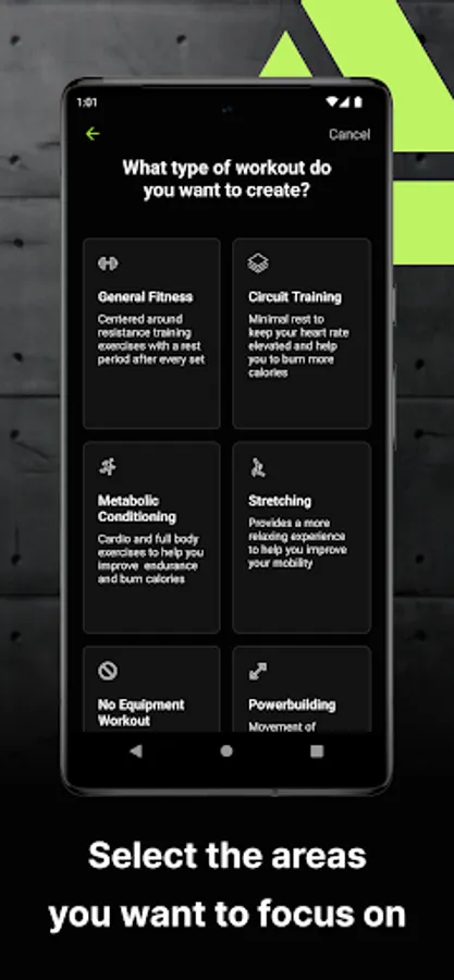After choosing your workout type, you can also choose what specific muscle or movement you want to work on. For instance, if you are looking for a glute workout, work on your deadlift or do a full body workout, we will instantly create the ideal workout based on your goals.