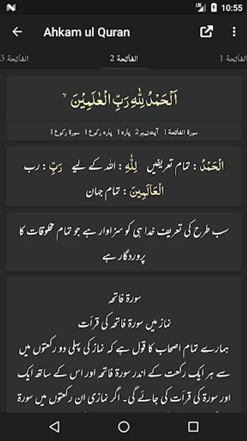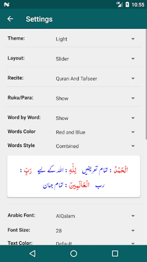 - Ability to show/hide Word by Word, Quran Translation (Tarjuma) and Tafseer