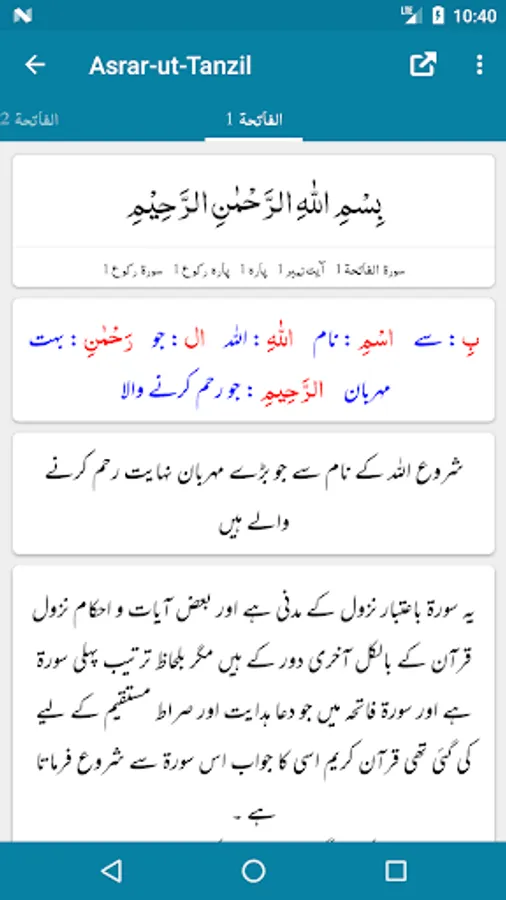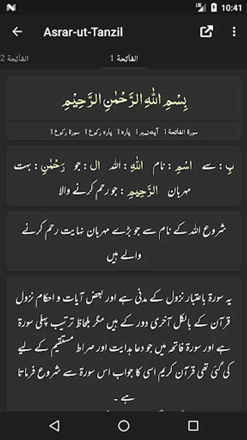 - Ability to show/hide Word by Word, Quran Translation (Tarjuma) and Tafseer