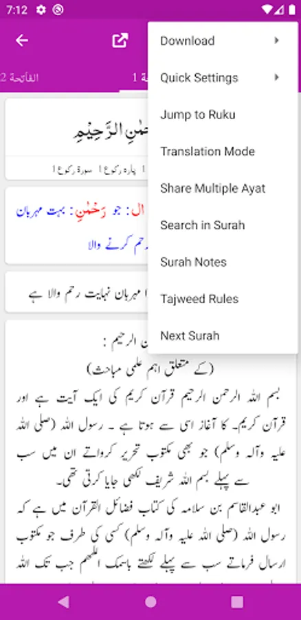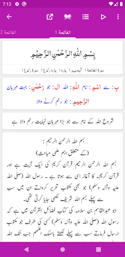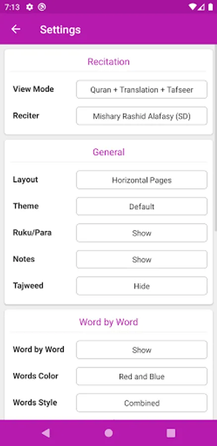 - Ability to show/hide Word by Word, Quran Translation (Tarjuma) and Tafseer