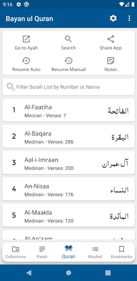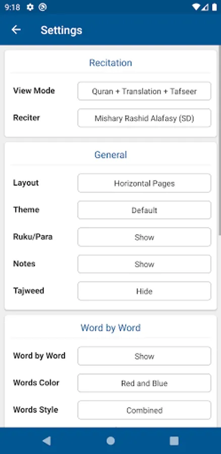 - Mushaf Mode: Recite Quran with Translation (Tarjuma) or Tafseer