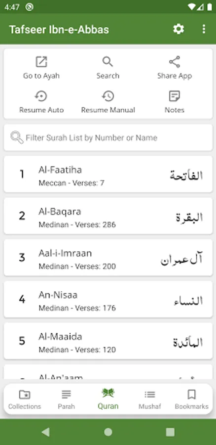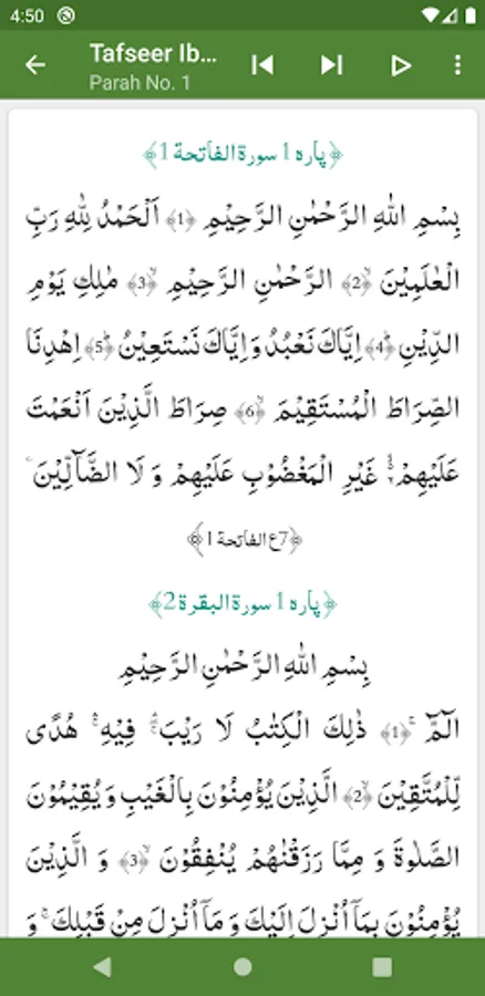 - Mushaf Mode: Recite Quran with Translation (Tarjuma) or Tafseer