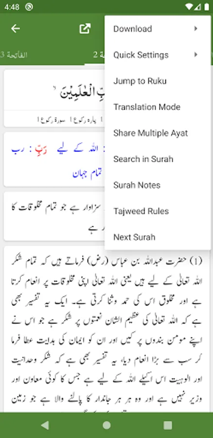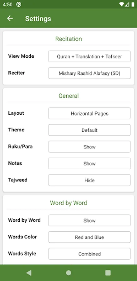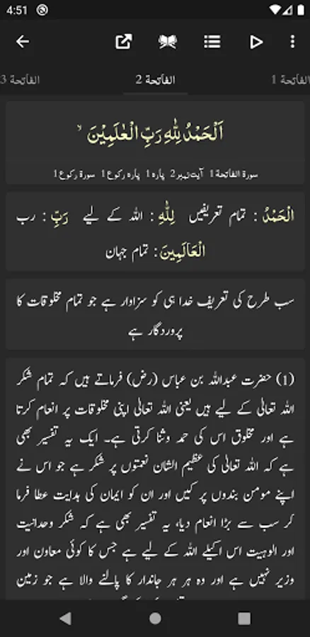 - Ability to show/hide Word by Word, Quran Translation (Tarjuma) and Tafseer