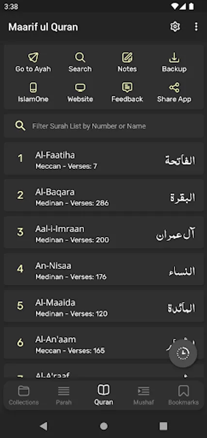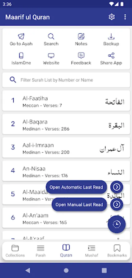 - Mushaf Mode: Recite Quran with Translation (Tarjuma) or Tafseer