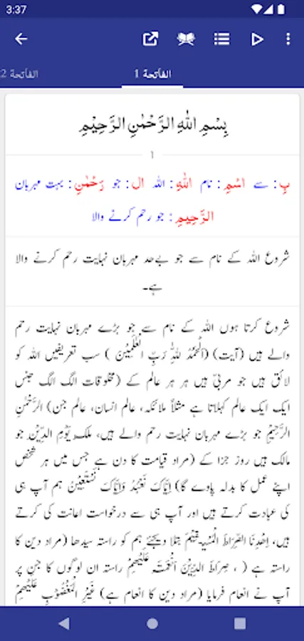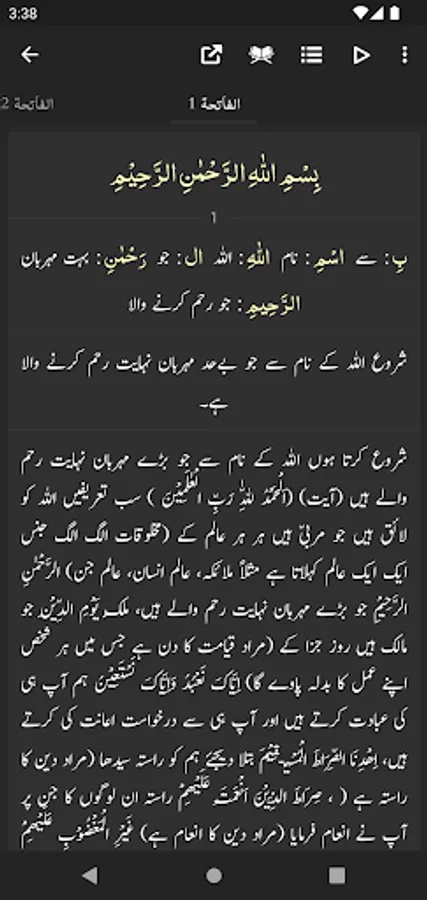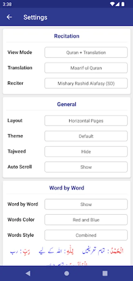 - Ability to show/hide Word by Word, Quran Translation (Tarjuma) and Tafseer