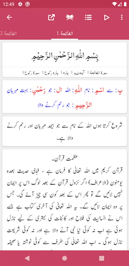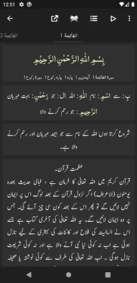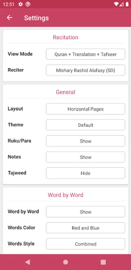 - Ability to show/hide Word by Word, Quran Translation (Tarjuma) and Tafseer