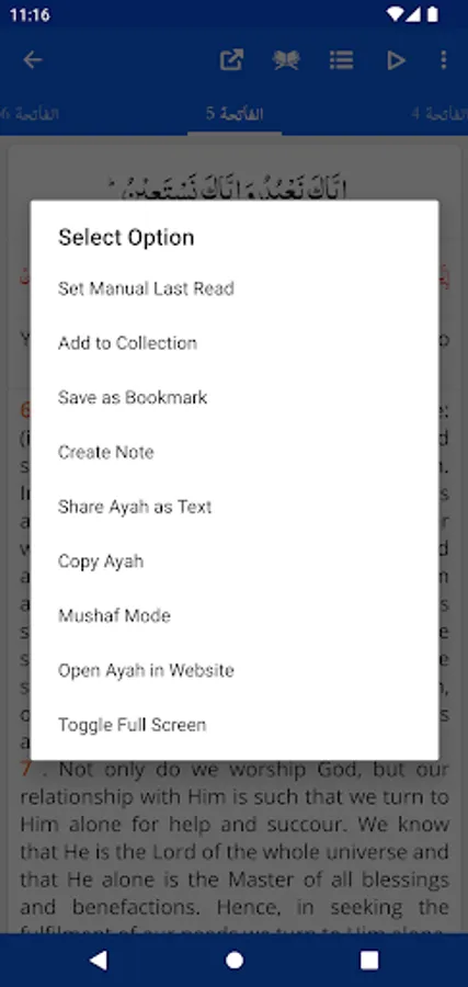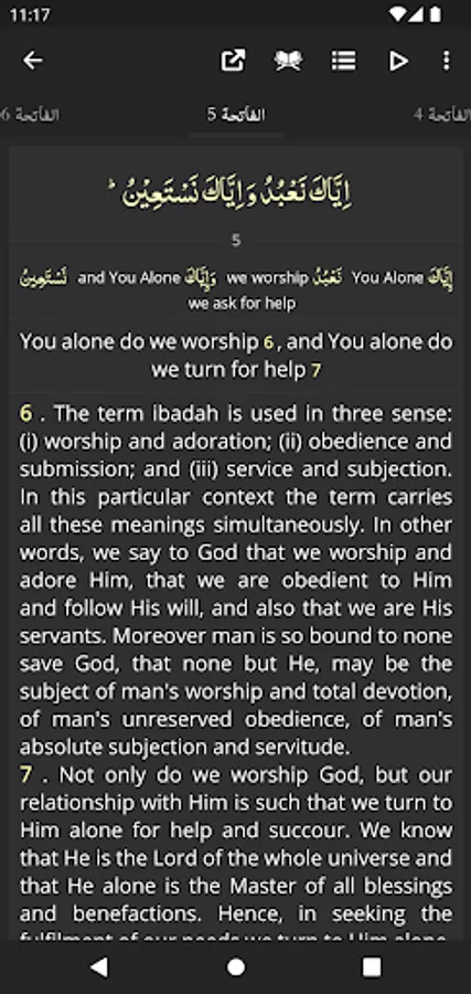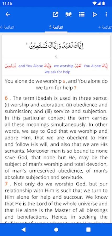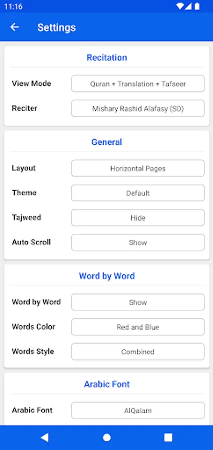 - Mushaf Mode: Recite Quran with Translation (Tarjuma) or Tafseer