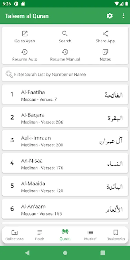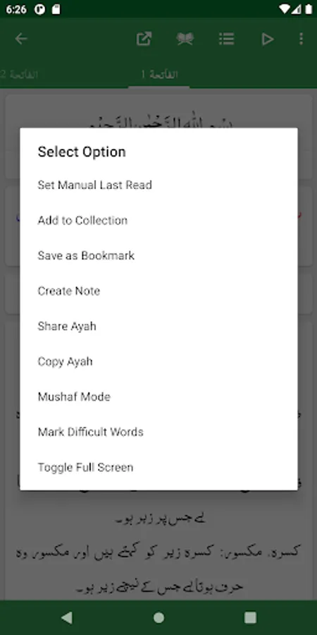 - Mushaf Mode: Recite Quran with Translation (Tarjuma) or Tafseer