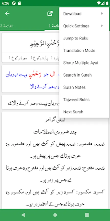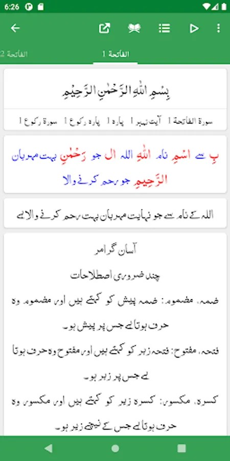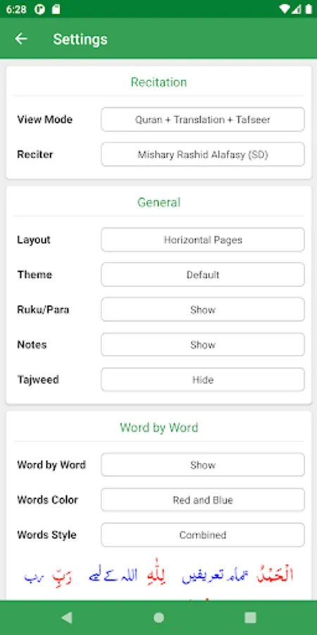 - Ability to show/hide Word by Word, Quran Translation (Tarjuma) and Tafseer