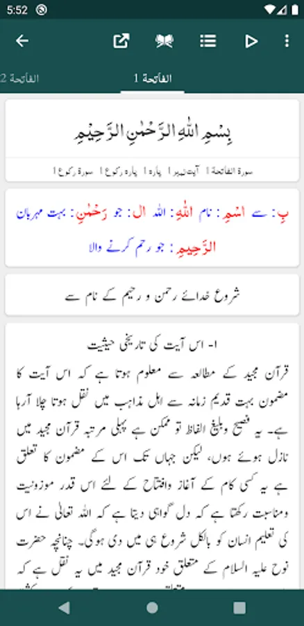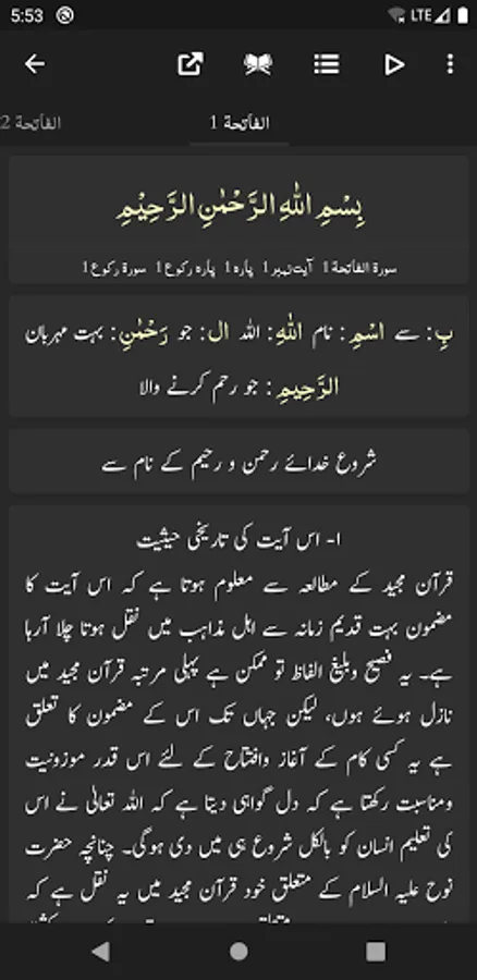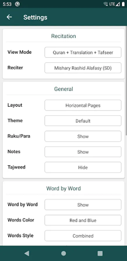 - Ability to show/hide Word by Word, Quran Translation (Tarjuma) and Tafseer