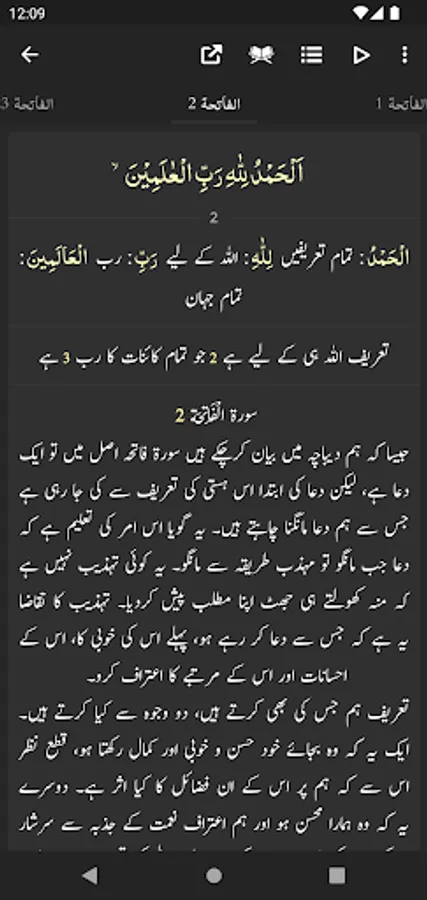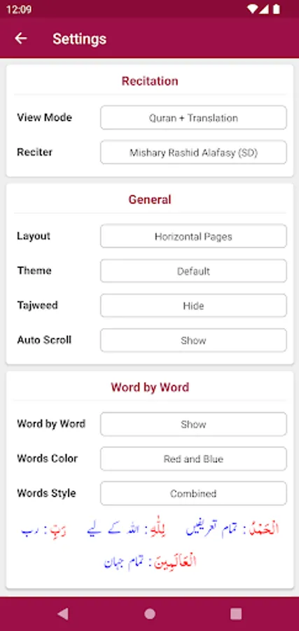 - Ability to show/hide Word by Word, Quran Translation (Tarjuma) and Tafseer