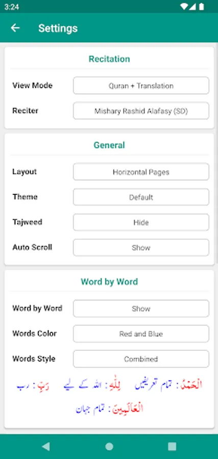 - Ability to show/hide Word by Word, Quran Translation (Tarjuma) and Tafseer