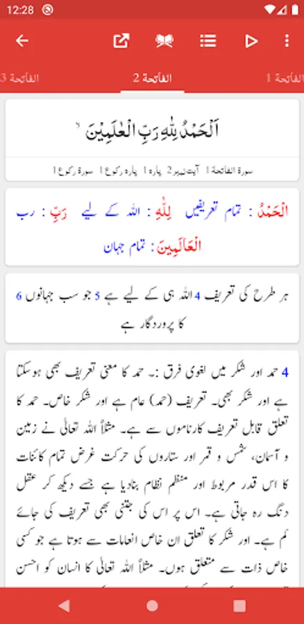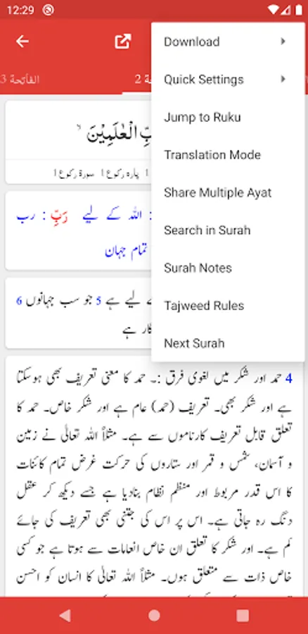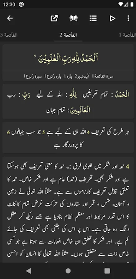 - Ability to show/hide Word by Word, Quran Translation (Tarjuma) and Tafseer
