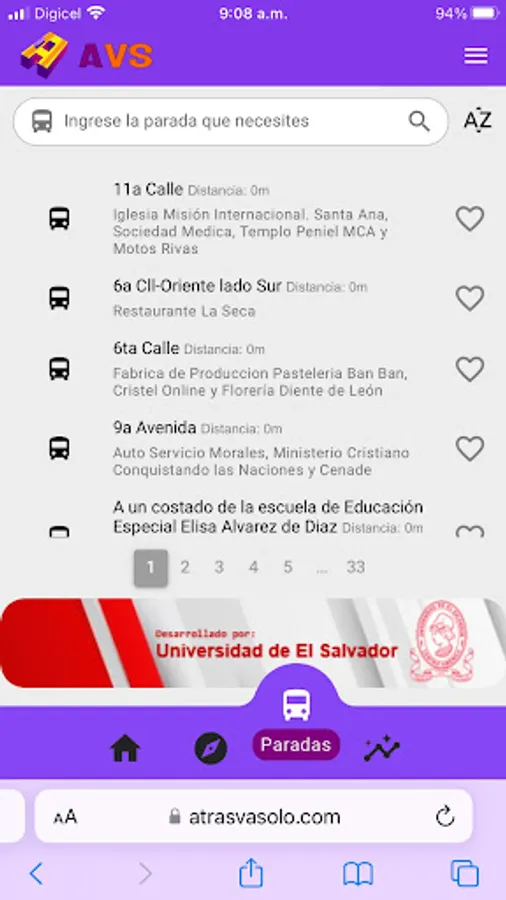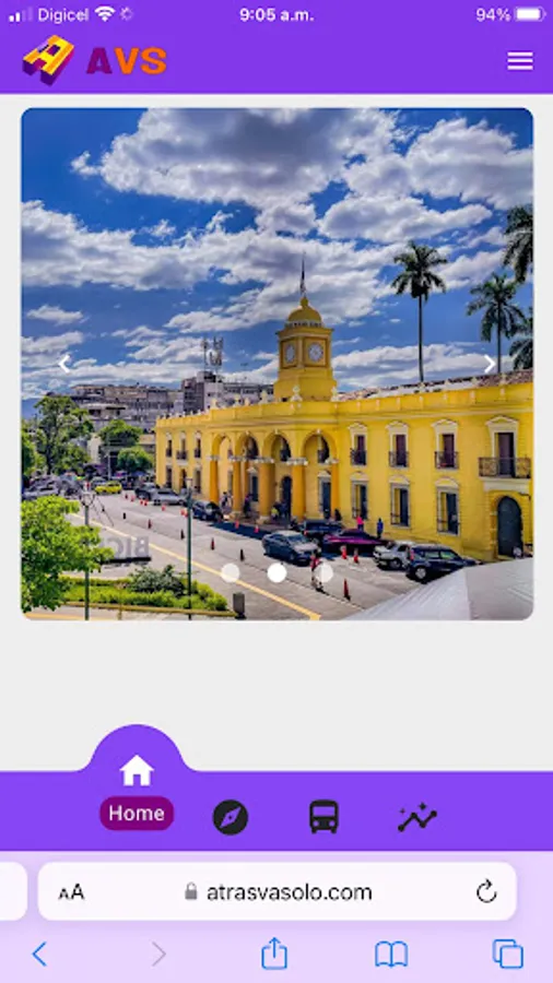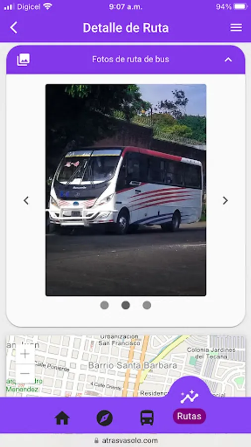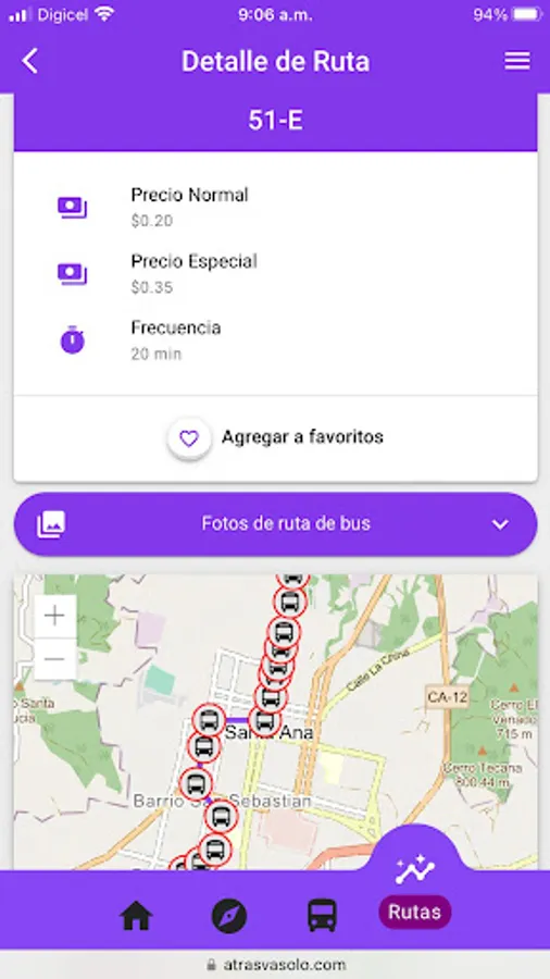 It shows information about the city of Santa Ana, in El Salvador, regarding bus stops, bus routes, photographs of the buses, prices, frequency times, routes.