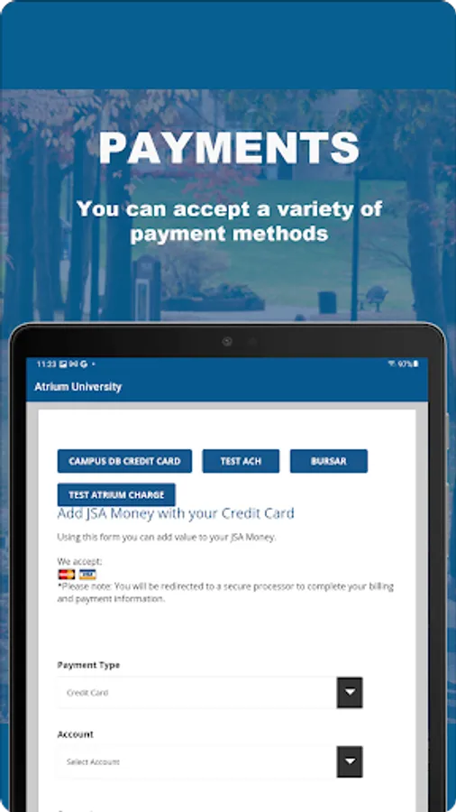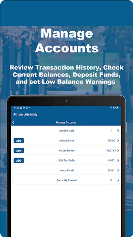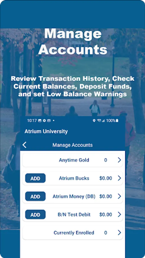 Account holders can access account history and use budgeting tools, all within their own campus-specific domain.
