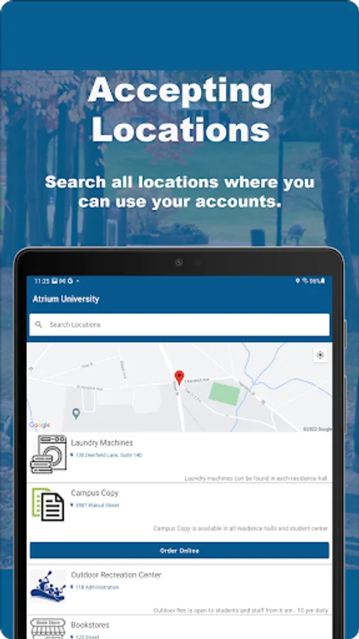 * View, filter, and map all locations that accept your ID card and place orders online