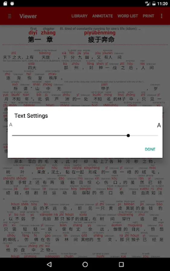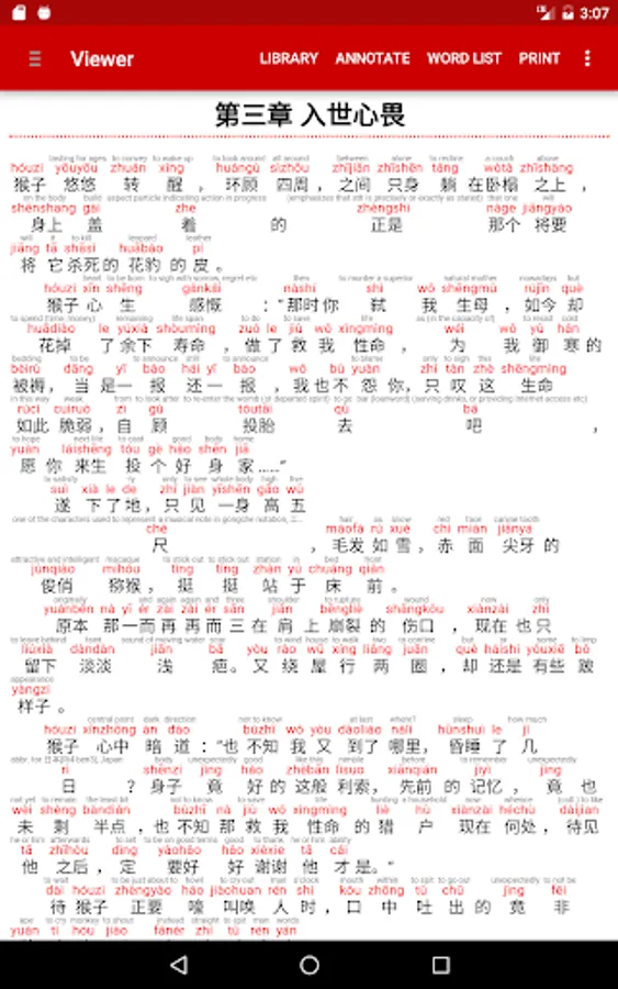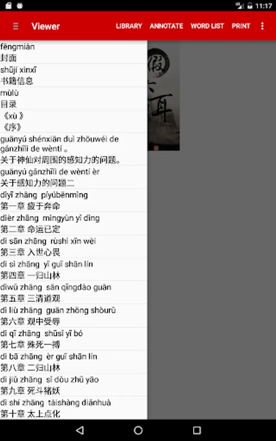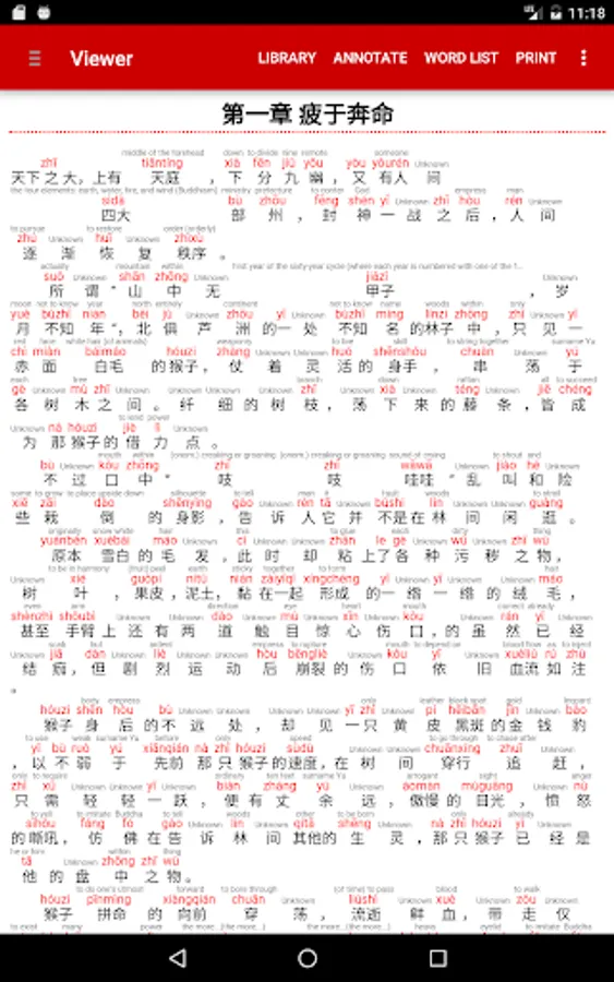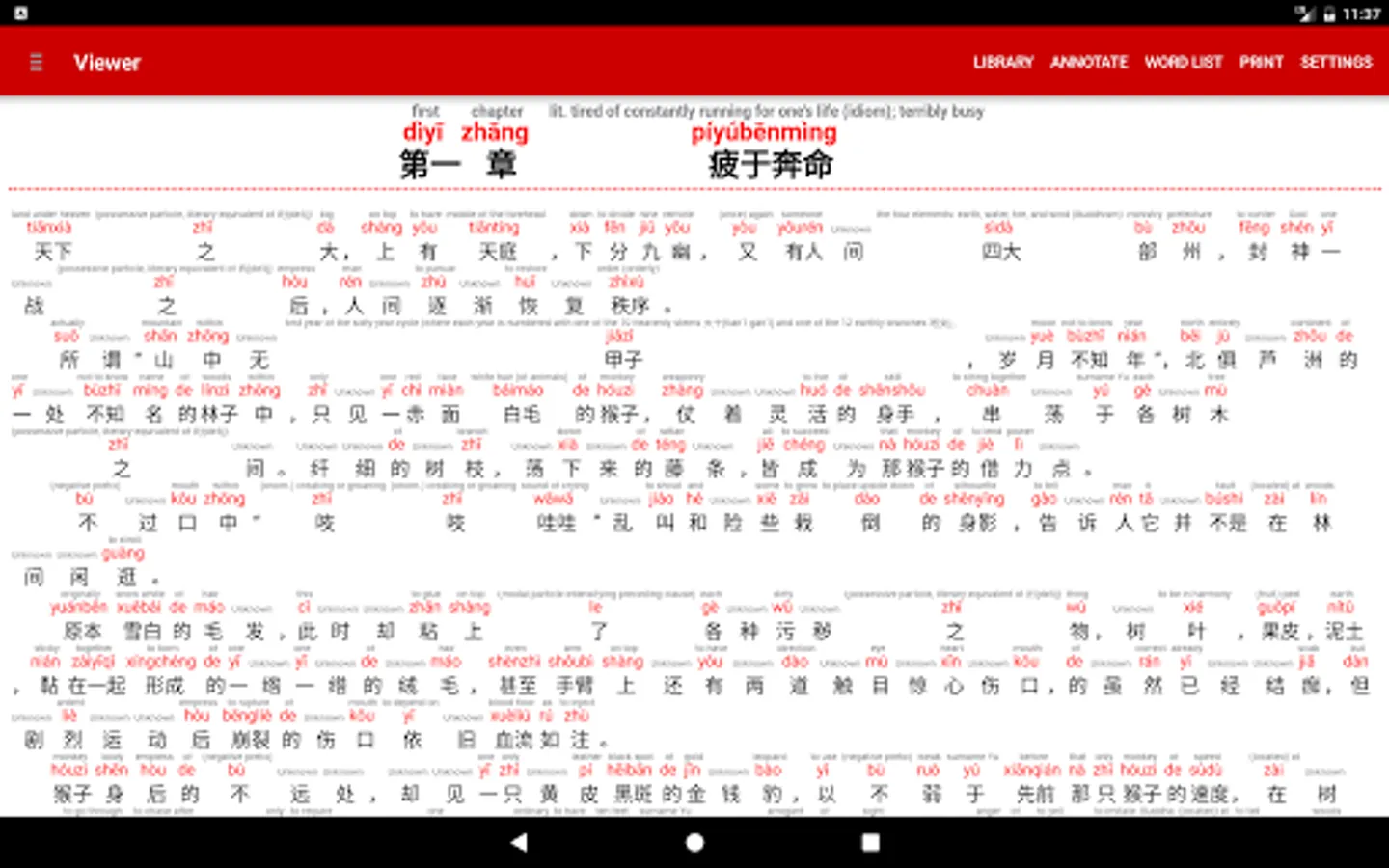 Download Chinese ePub files and annotate with pinyin and English. Allows you to indicate which words you already know the pinyin or English for, and will not show the annotation for those. You can also share a URL from a browser and open that page in Chinese Annotator to annotate the Chinese text. In addition, Chinese text can be copied and pasted in to the app for annotation.
