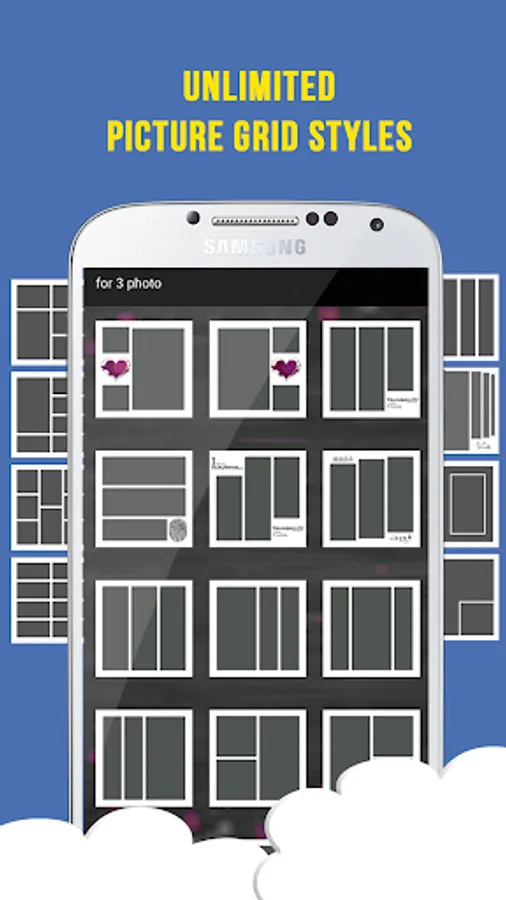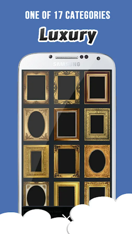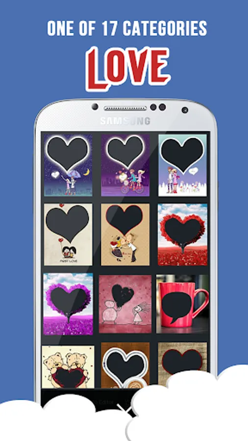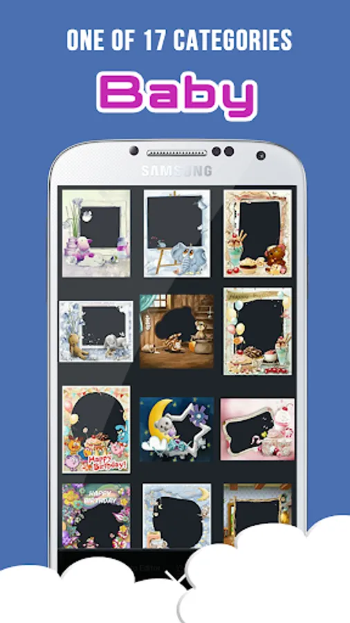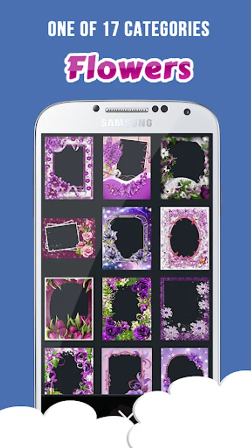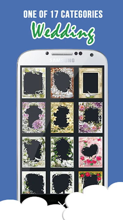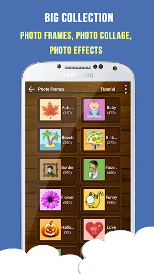 "Frame Photo Collage" offers photo frames with different genres like funny photo, baby, kids, love, Christmas day, valentine day, flower, wedding, men, beach, billboard, border frames, native, autumn, etc