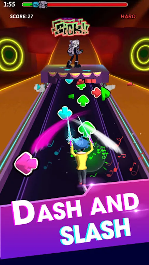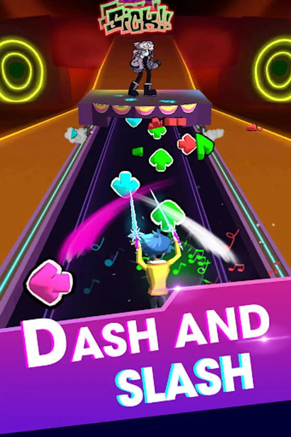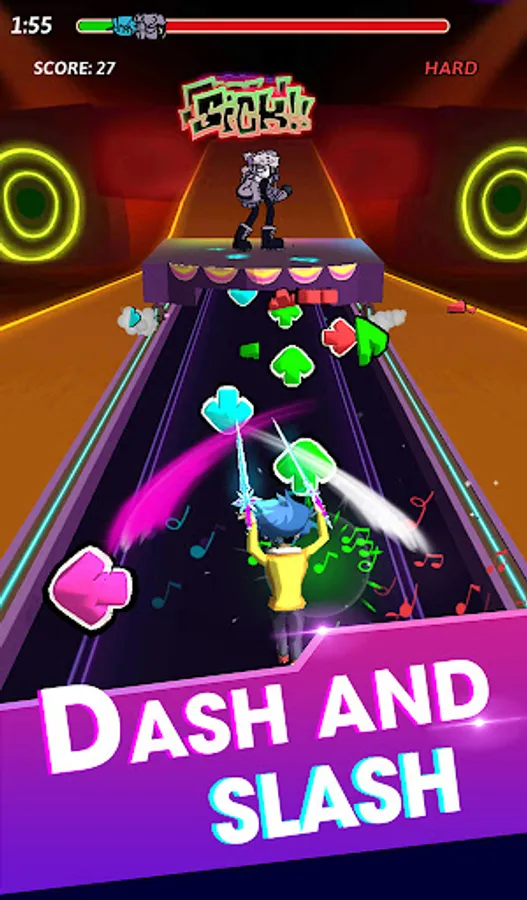 - Dash and Slash all music tiles that run in your way. Remember to stay away from your opponents' arrows too