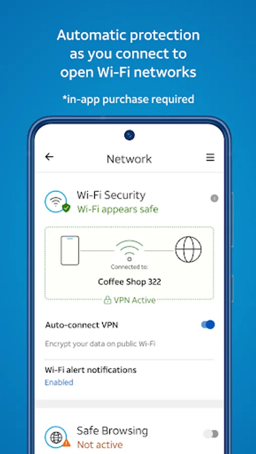 • Safe Browsing. May not detect all suspicious websites. Requires activation of Public Wi-Fi protection to be enabled.