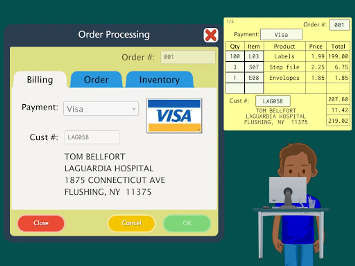 - Students progress from basic tasks to entering orders, checking inventories, and
