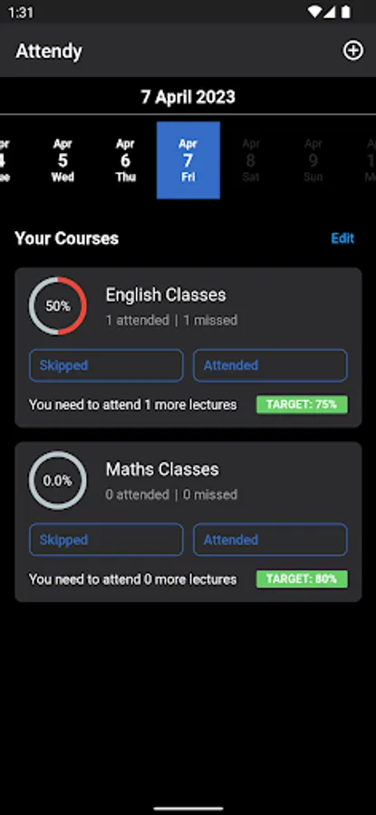 Attendy helps you track your attendance so you don’t have to worry on how many classes you can miss or need to attend.
