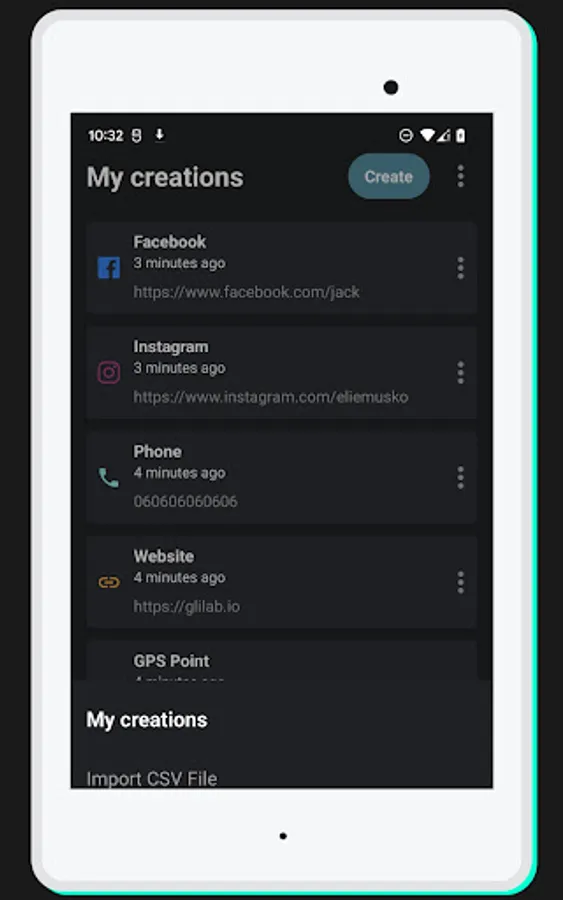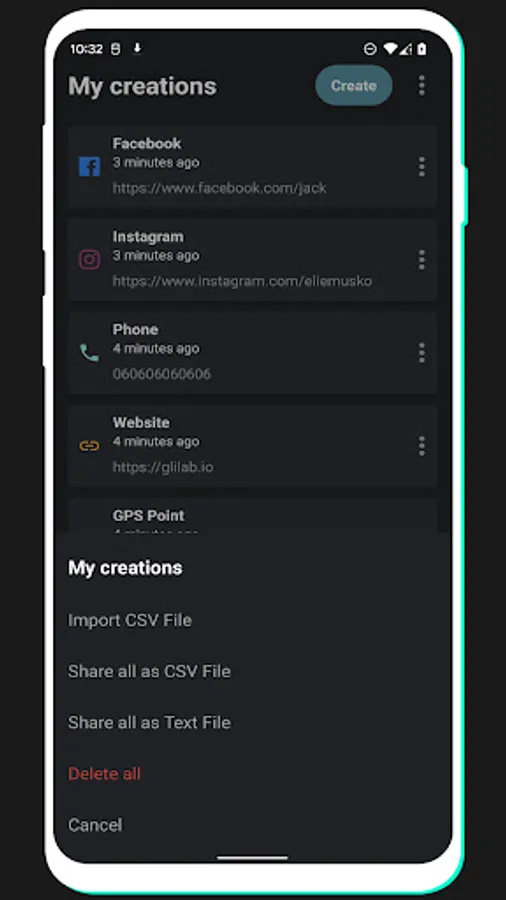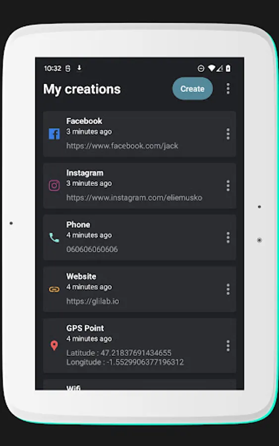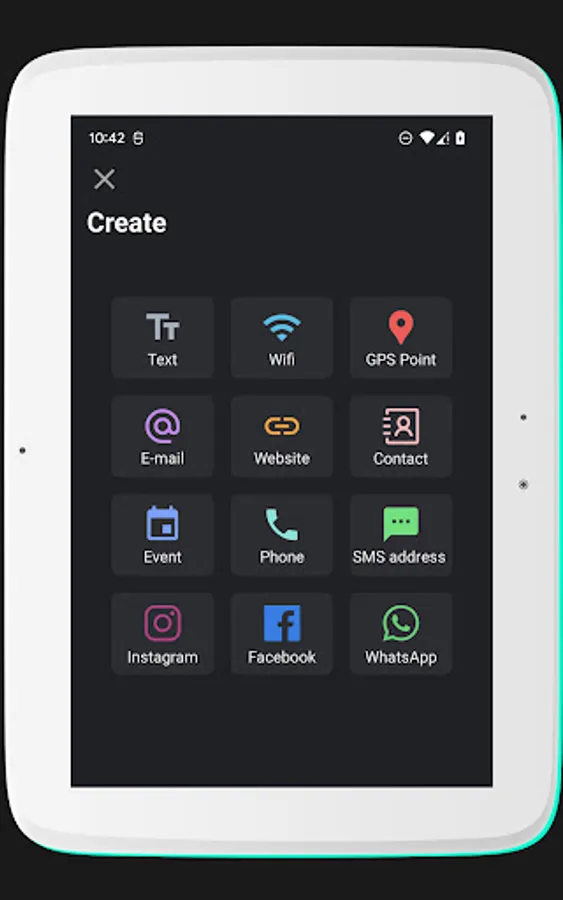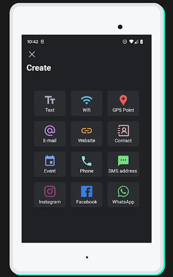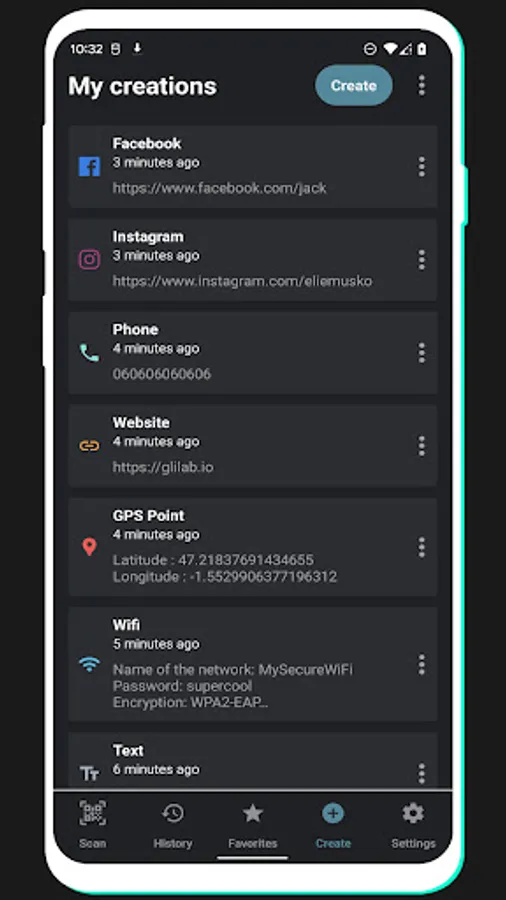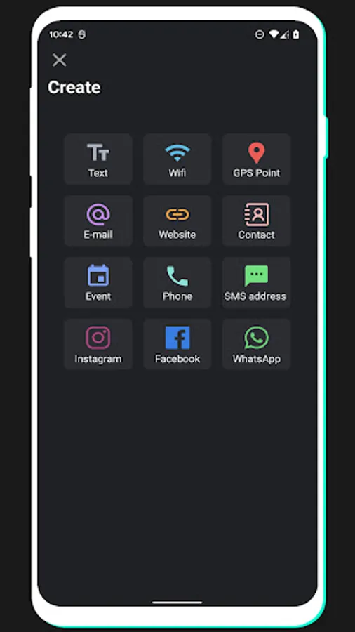 Scan and create QR Code for event, Wifi, contact, SMS, phone, Facetime, email, web link, Facebook & Instagram profile, and WhatsApp.