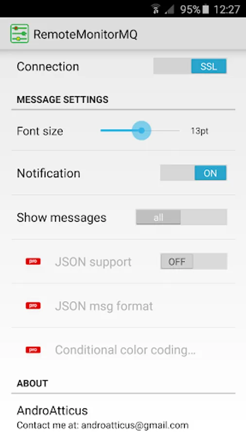RemoteMonitorMQ supports amqp and amqps connection setting toward an AMQP message broker, topic type exchanges and stacked notification on message consumes. Font size increase/decrease by swipe up/down on the left half of the screen.