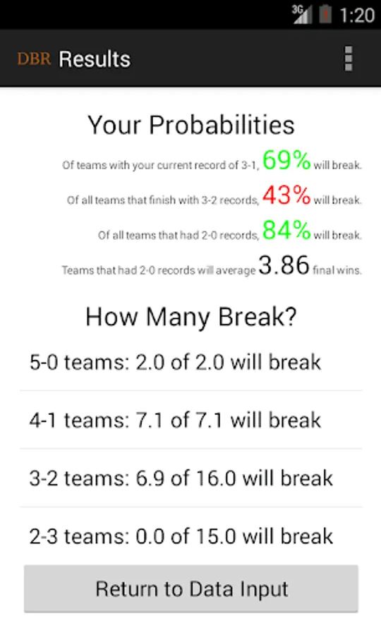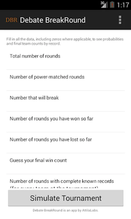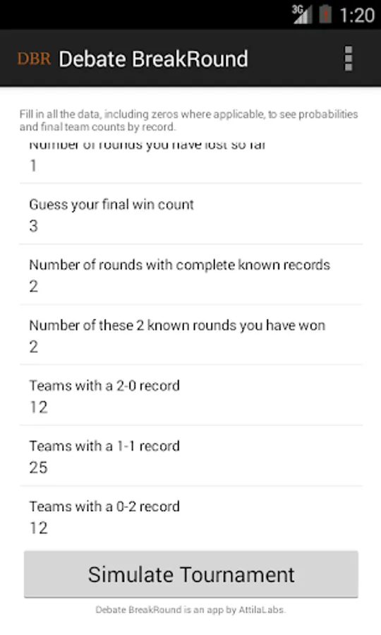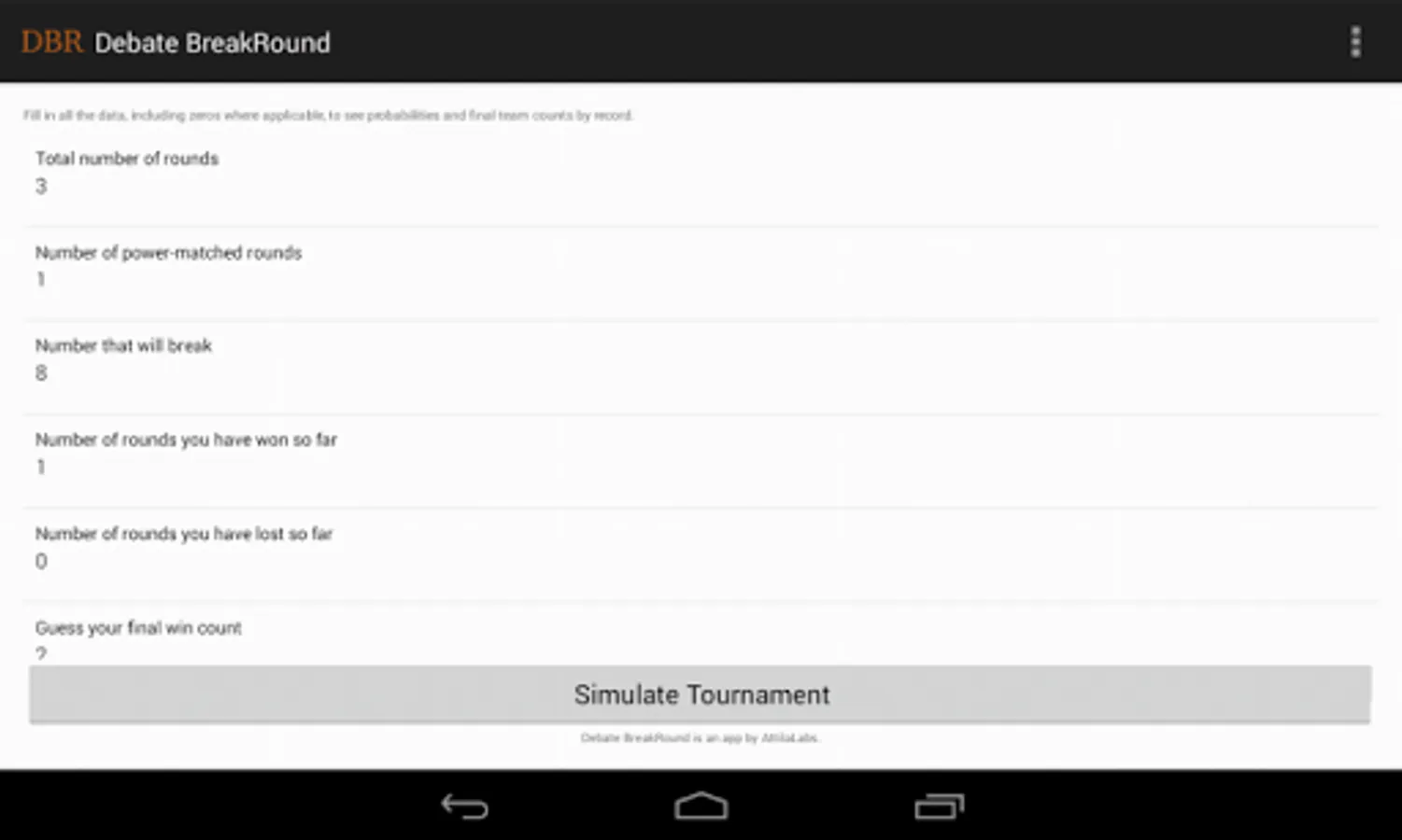 Debate BreakRound is the best app on the market for debate statistics (breakdowns). Primarily designed for high school Public Forum Debate (PFD) and Lincoln-Douglas Debate (LD), this app uses basic information about a debate tournament to compute probabilities and outcomes, including the probability of breaking, the required number of wins to break, and the predicted tournament bracket.