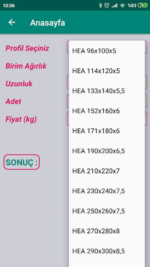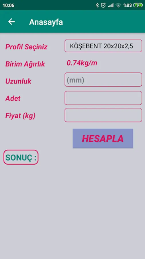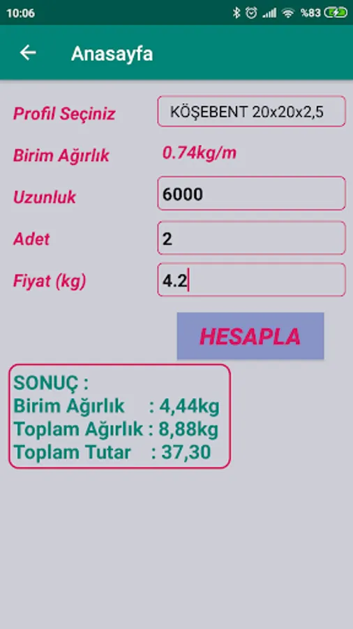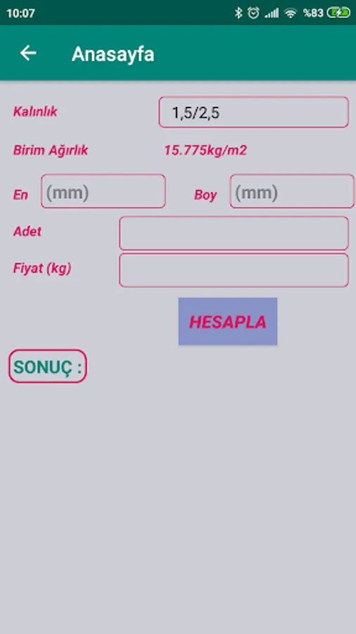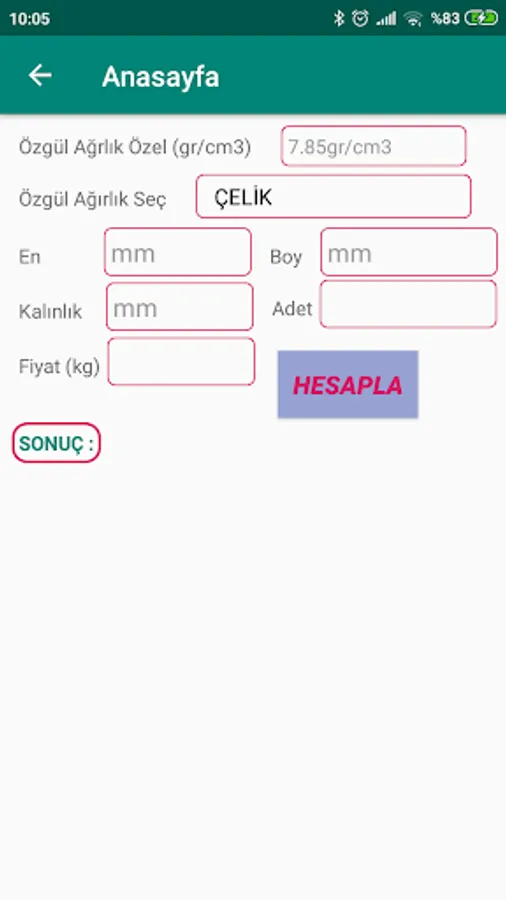 The original metal weights used in calculating sheet metal are presented in a ready list. When you want to calculate a different material, you can also calculate different materials by writing the specific gravity of the material in gr / cm3.