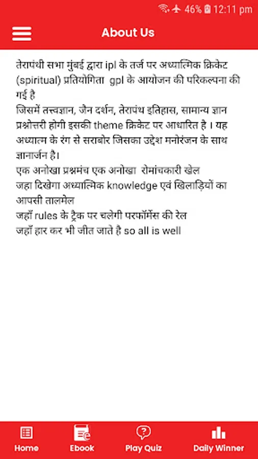 जिसमें तत्त्वज्ञान, जैन दर्शन, तेरापंथ इतिहास, सामान्य ज्ञान प्रश्नोत्तरी होगी इसकी theme क्रिकेट पर आधारित है । यह अध्यात्म के रंग से सराबोर जिसका उद्देश मनोरंजन के साथ ज्ञानार्जन है।