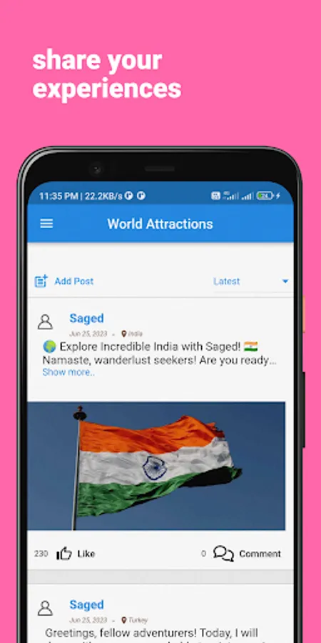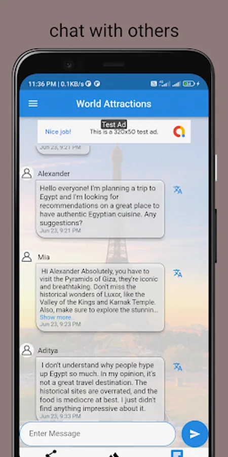 But the exploration doesn't end there. Our app also brings travelers together, fostering a vibrant community of like-minded individuals. Connect with fellow travel enthusiasts from around the world, share your travel experiences through posts, and engage in inspiring conversations about your adventures. With the public chat feature, you can exchange tips, recommendations, and insider insights to enhance your travel plans and create lifelong connections.